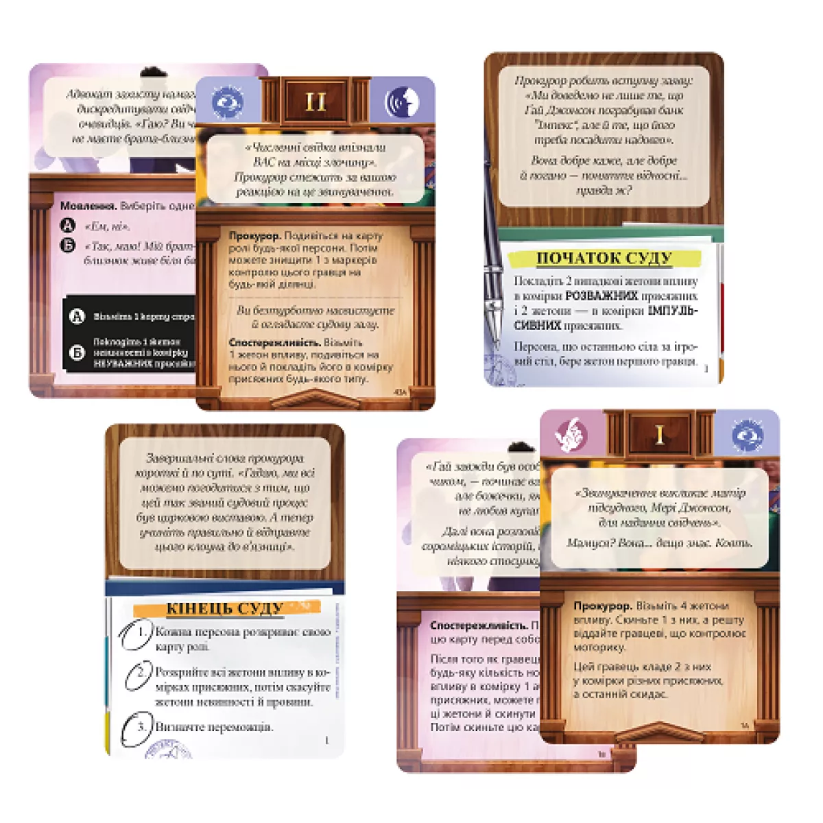 У коробці 13 карт ролей, 48 карт суду, 4 карти сюжету, 1 жетон першого гравця, 48 маркерів контролю, 6 ключок для розміщення, 24 карти стратегій, 1 планшет мозку, 30 жетонів впливу, 15 жетонів невинності/провини, 5 пластикових перекладин і платформ ділянок, 1 ігрове поле, 1 ширма прокурора, 5 пам'яток
