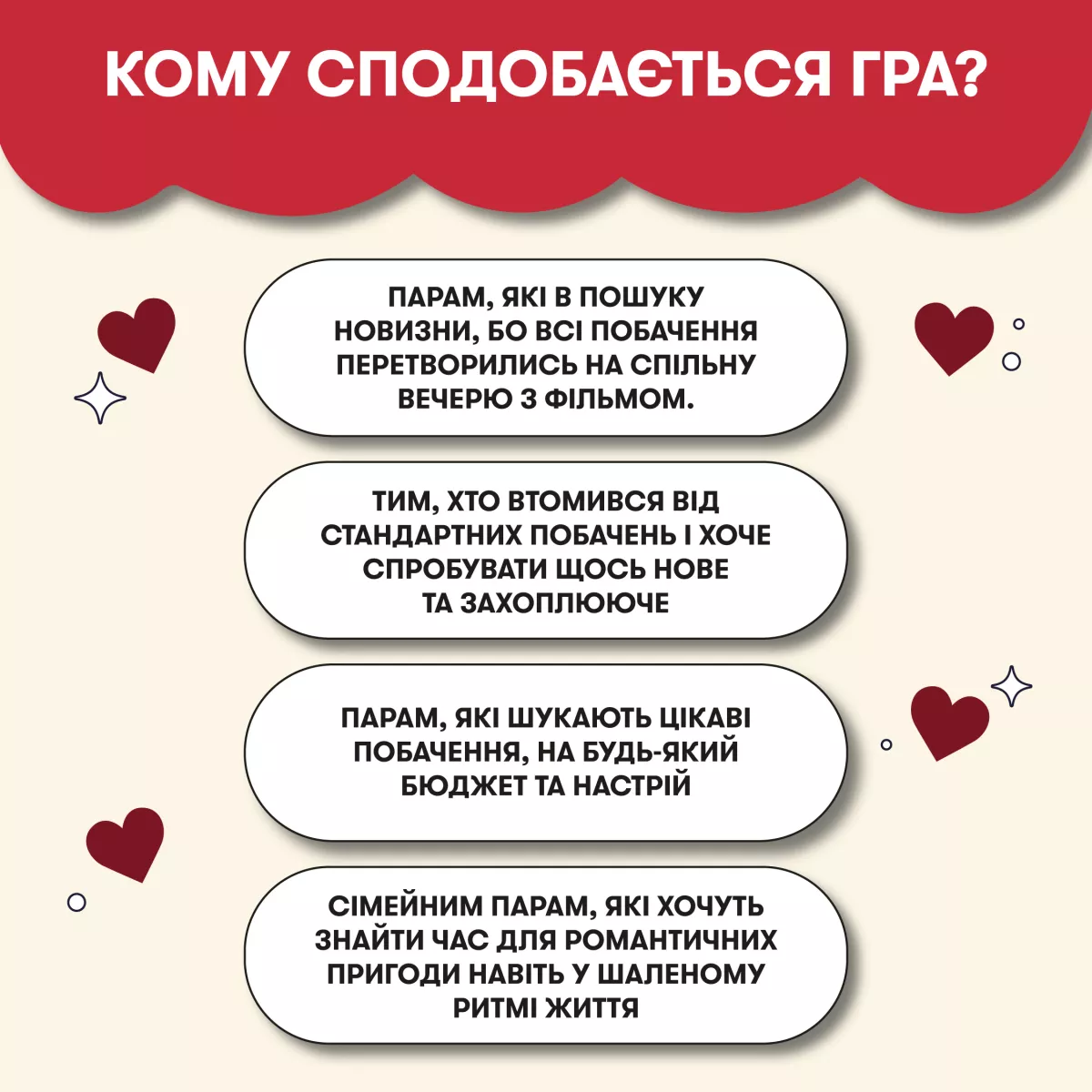 • Відновлення іскри: Допомагає відійти від рутини та наповнити стосунки свіжими емоціями.