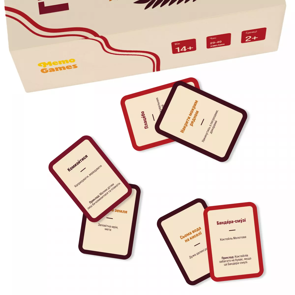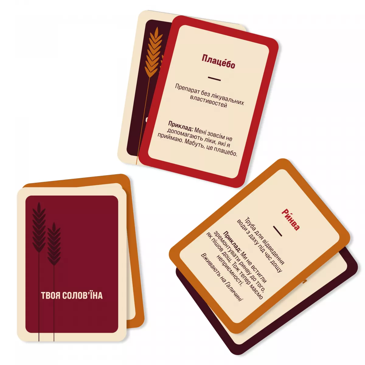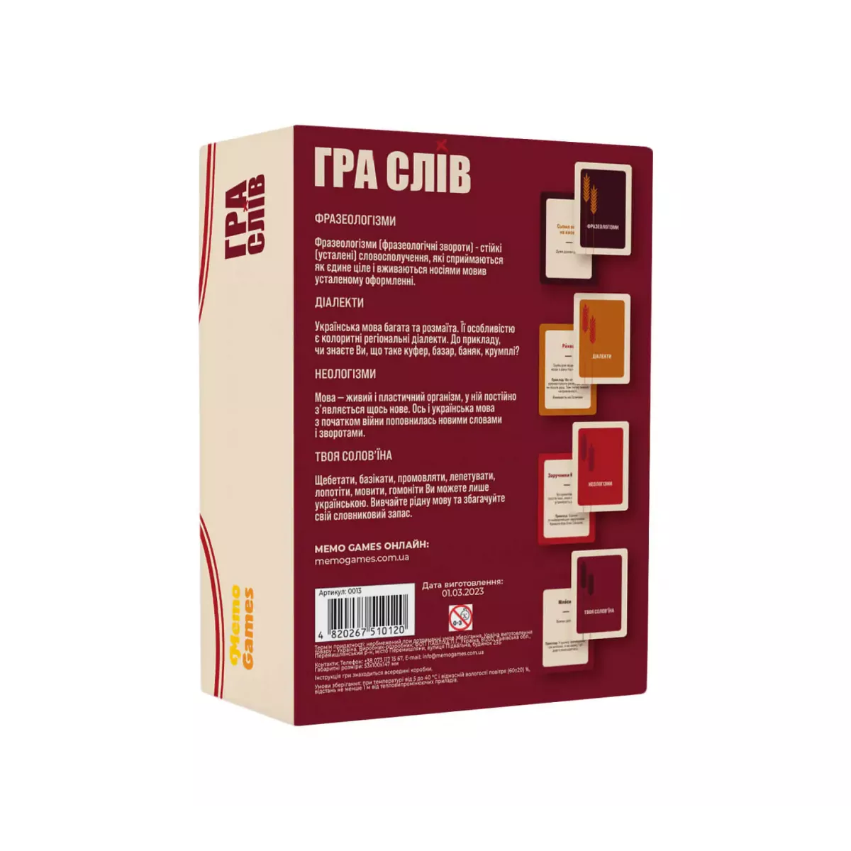 Наскільки гарно ви знаєте і володієте рідною мовою? Ви впевнені, що знаєте, хто такий «кумпель»? Або що значить вислів «накрити мокрим рядном»? Деякі колоритні та красиві слова, на жаль, з часом забуваються, особливо під впливом запозичених слів та нещадної русифікації. І коли ж, як не зараз, згадати своє коріння, відновити традиції та ще й в ігровій формі з настілочкою Гра слів. Це розумна розвага і для гучної компанії на вечірці, і для спокійного сімейного вечора. У неї можна грати і як у вікторину, і на швидкість, використовуючи годинник, що є в коробочці. Впродовж гри часом спливатимуть у пам’яті слова, які вам казали бабусі та дідусі, які ви чули під час подорожей країною, або десь дізналися, але їхнє значення не було зрозуміле до кінця, слова, почувши які, будете впевнені, що вони точно «іноземці», а фразеологізми – однозначно виявляться свого роду шок-контентом. Основна ідея  та мета цієї гри – це розширення словникового запасу, навчання у ігровій формі та просто отримання задоволення від спілкування рідною солов’їною. Замовляйте настілочку Гра слів, вивчайте нові слова та фразеологізми, розвивайте своє мовлення та спілкуйтеся українською, бо воно того варте! А перевірити, як добре ви вже знаєте історію, літературу та географію України можна у грі-вікторині Як я цього не знав? Ukraine edition.