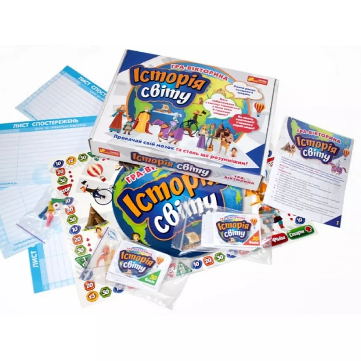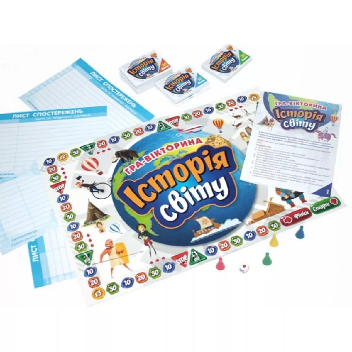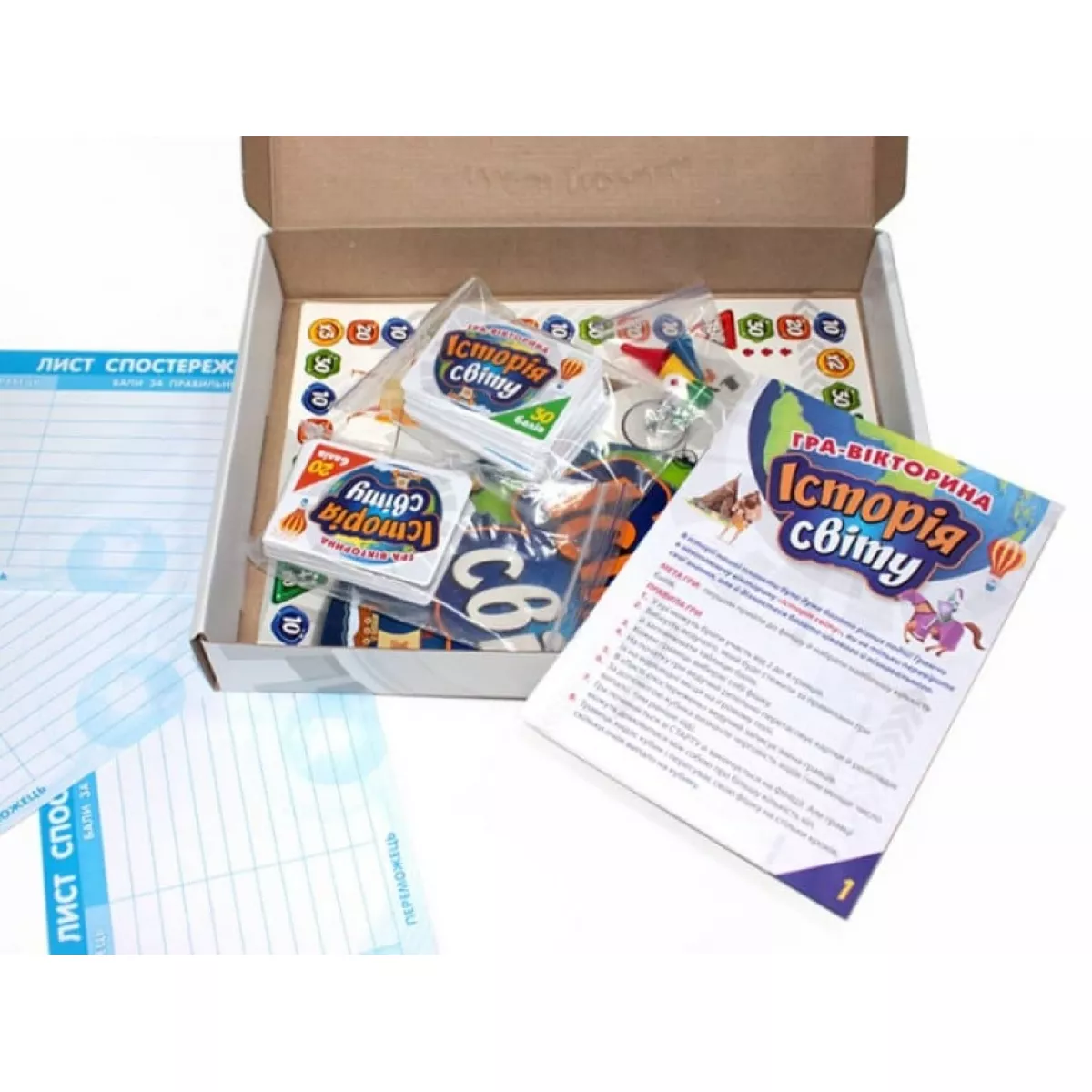 У коробці ігрове поле, фішки і кубик, картки 10 балів, картки 20 балів, картки 30 балів, листи спостережень, правила гри, відповіді на питання