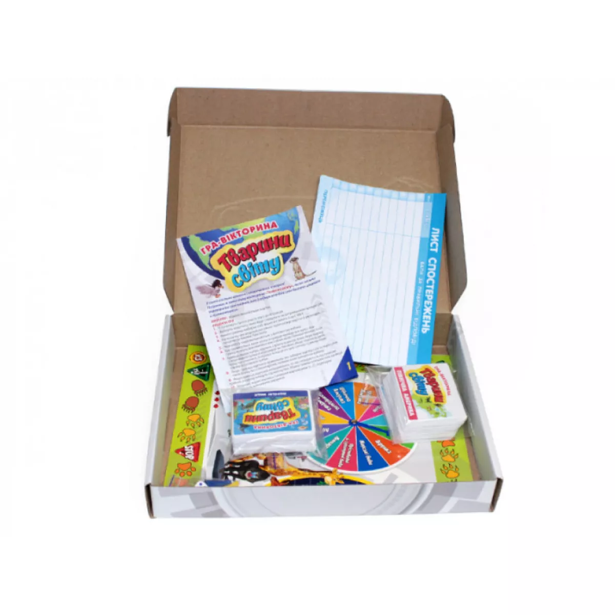 У коробці 186 карт;, ігрове поле;, 4 фішки;, кубик;, "Листи спостережень" для підрахунку очок;, Брошура правил гри і відповідей на питання вікторини.