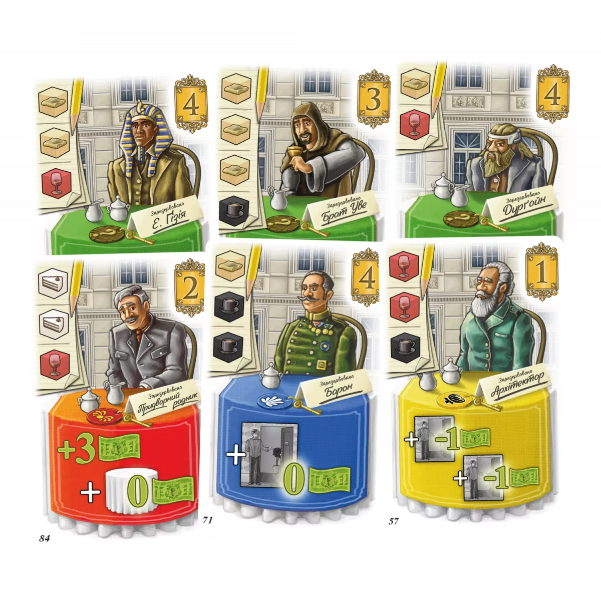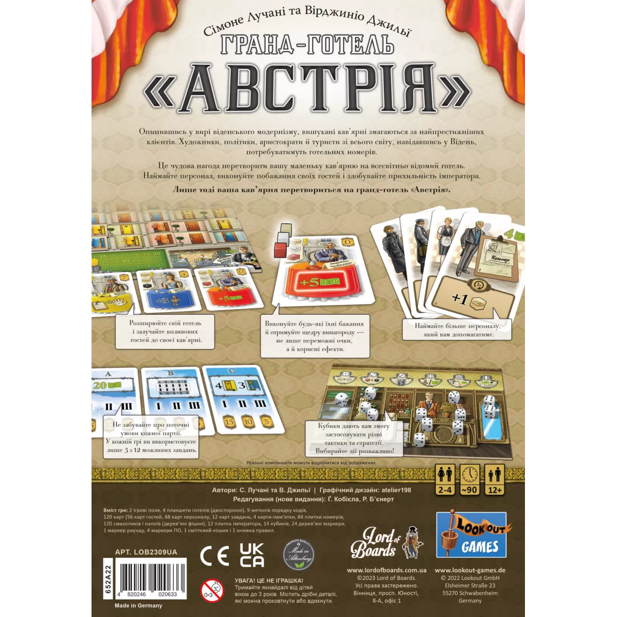 Які побажання до звичайного готелю? Ліжко, вбиральня, бажано - відсутність тарганів. Але що ж вимагають від готелю екстра класу? Оооо, тут спершу потрібна майстерність – супер сервіс! Також добірна кава, ніжні тістечка, професійний персонал, неймовірний вид з вікон номеру та ще сотні тисяч усіляких дрібничок! І гра Гранд-готель «Австрія» дасть змогу відчути себе адміністратором такого готелю та спробувати привести його до процвітання, зробивши найвідомішим готелем на весь Відень! Гранд-готель «Австрія» (Grand Austria Hotel) - це єврогейм для компанії від 2 до 4 гравців, кожен з яких матиме власне двостороннє поле готелю (ну, ви знаєте готелі: номери, кухня, ресторанчик), загальний планшет підрахунку очок та прихильності Імператора, а також окреме поле, на якому гравці і зможуть обирати, яку з дій виконати цього раунду. Саме у цих діях і ховається основне зерно гри! Адже окрім базових дій, які гравець може виконувати в свій хід, є ще дії, які визначаються кидком кубів. Та не одного, а 14 кубів! І, залежно від результату, ці куби розподіляються серед 6 комірок, кожна з яких відповідає за свою подію. Слідом перед гравцями постане питання: виконати дію з комірки, де лежить менше кубів, а значить менше разів за цей раунд хтось зможе її активувати, або ж звернути свою увагу на комірку із великою кількістю кубів і повторити дію декілька раз. Та не забуваймо про переможні очки! Аби ваш готель став найвідомішим - про нього повинні говорити люди! Кожен задоволений гість, який отримає своє замовлення та заночує у підходящому номері, принесе вам популярність. Також важлива кількість заповнених номерів. Погодьтеся, що більше хочеться довіряти тому місцю, яке користується попитом серед людей. Це означає, що там точно організують відпочинок вищого класу! А ще є прихильність Імператора (який може як осипати власника готелю золотом, так і навпаки, накласти величезні штрафи), унікальні особливості найманого персоналу, яких аж 48 чоловік, карти політики, контроль за фінансуванням, та це ж буквально контроль за величезним бізнесом! І якщо ви готові випробувати себе і друзів у змаганні на звання «Кращого адміністратора гранд-готелю», не зволікайте - замовляйте коробочку з грою Гранд-готель «Австрія» до своєї колекції! А якщо вас приваблює механіка випадковості з кубами, та, разом з тим, ви бажаєте пограти у єврогру, – зверніть увагу на затишне французьке середньовіччя у грі Замки Бургундії.