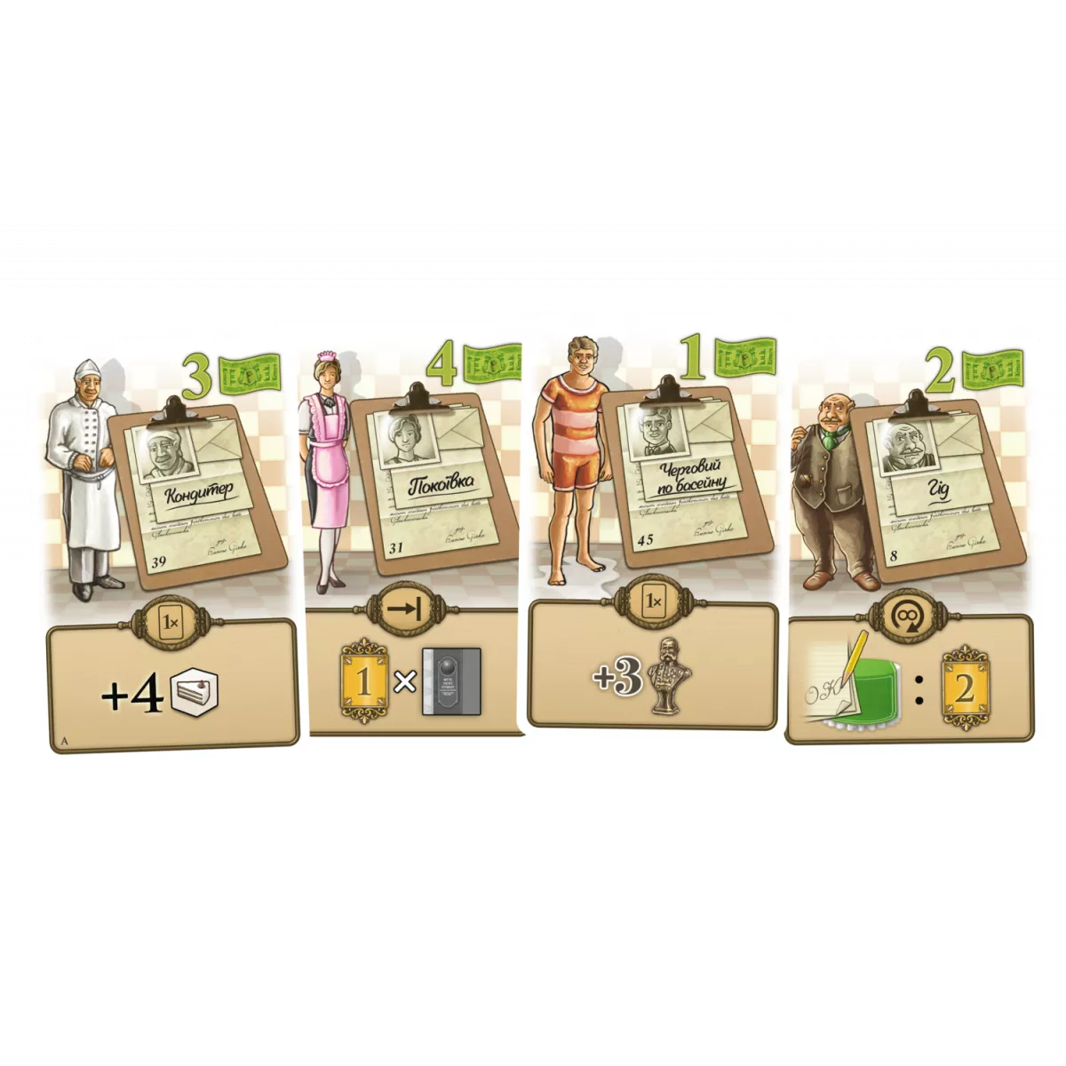 У коробці Ігрове поле , Поле для дій - рецепція 4 двосторонніх планшета готелів , 56 карт Гостей , 48 карт Персоналу , 12 карт Політики , 4 Пам'ятки , 9 тайлів черговості ходу , 84 тайла кімнат (номерів) , 120 маркерів їжі (по 30 дерев'яних кубиків 4-х видів їжі і напоїв) , 14 кубиків D6 , 25 дерев'яних дисків обліку службової інформації (4-х різних кольорів + 1 чорний для обліку раундів) , 12 тайлів Імператора , 4 тайла переможних очок , 1 сміттєвий бак , Правила гри