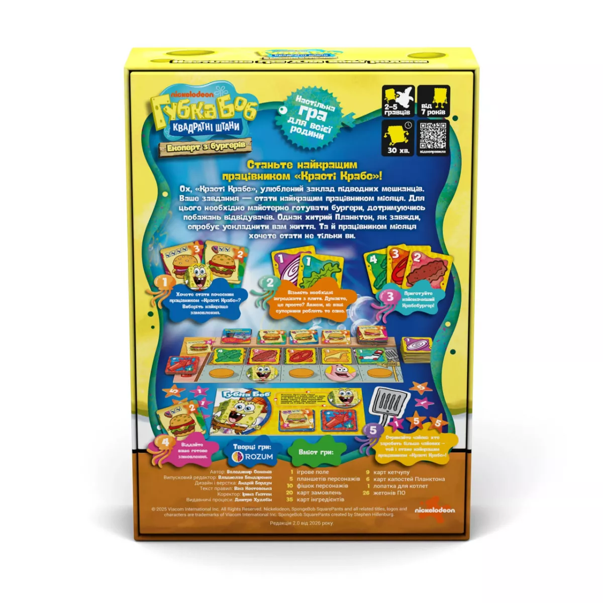 | У коробці | 1 ігрове поле, 5 планшетів персонажів, 10 фішок персонажів, 20 карт замовлень, 35 карт інгредієнтів, 9 карт кетчупу, 6 карт капостей Планктона, 1 лопатка для котлет, 26 жетонів ПО |