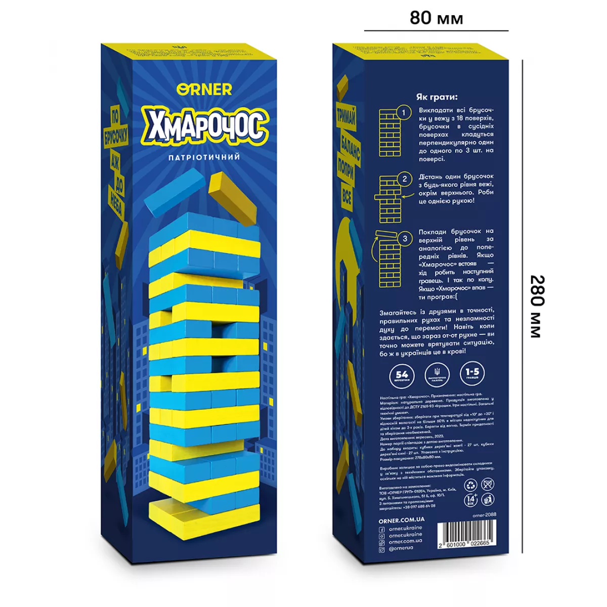 Ламати легше, ніж будувати, але будувати точно цікавіше! Особливо коли будуєте башту з її ж фрагментів. І з кожним брусочком стає все складніше, але і азартніше! Хмарочос Патріотичний (Дженга, Jenga) це гра, яку, напевно, бачив кожний хоч раз у житті. Підійде вона для компанії від 1 до 5 гравців, руки у яких не дрижать у найвідповідальніший момент! На словах дії прості, а от коли перейти до діла… Спершу до гри треба підготуватись, виставивши всі 18 поверхів башти, по три брусочки кожний. Це досить медитативний процес, а зважаючи на патріотичні кольори брусочків він стає ще й творчим, адже кожні два поверхи споруди утворюють кольори прапору України. Після цього настає хід гравця – відповідальний момент – треба витягнути з середини споруди один брусочок та покласти його на вершину. Так робить наступний, і наступний гравець, аж поки… Поки вся «Вавилонська вежа» не впаде із страшенним гуркотом!  І хоч переможцем стане саме той, хто зміг останнім покласти брусочок на вершину вежи, за кожним ходом всі гравці спостерігають затамувавши подих, адже будь-яка помилка може привести до «Рестарту». Тому якщо ви полюбляєте ігри, у яких треба використовувати логіку, планування, вираховувати ступінь нахилу та силу тертя усіх компонентів, а до всього поруч з ігровим столом у вас нема крихких предметів – обов’язково придбайте всесвітню відому гру Хмарочос Патріотичний у таких рідних жовто-блакитних тонах. Та якщо звичайні прямокутні брусочки це для вас занадто просто, то зверніть увагу на гру Стільчики EXTRA, у яких треба будувати башту буквально із стільців!