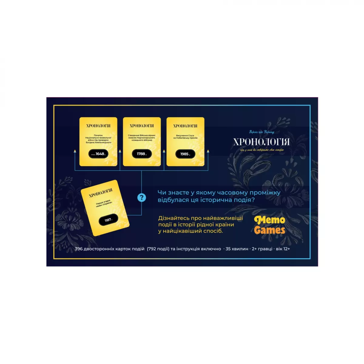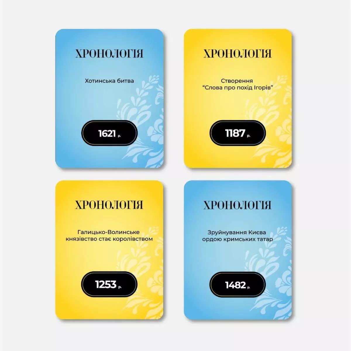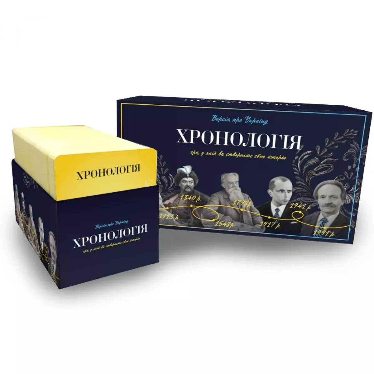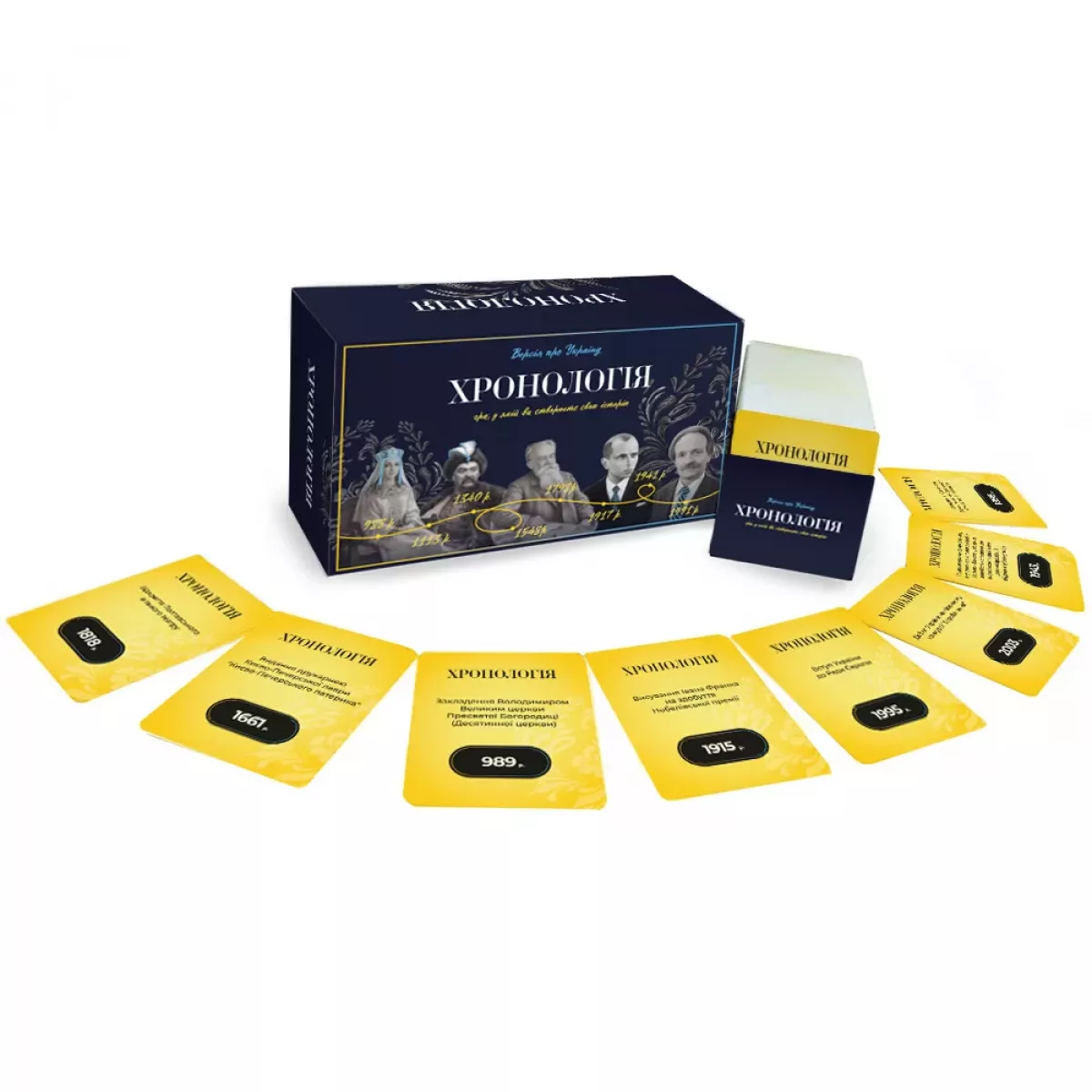 Олександр Довженко писав: «Народ, що не знає своєї історії, є народ сліпців». Та знати історію - це не лише розуміти, що колись там давно жив собі Богдан Хмельницький, це і про орієнтуватися у часових проміжках (ну хоч приблизно!). А у грі Хронологія: Історія України ви разом з друзями та сім’єю зможете не тільки перевірити свою пам’ять щодо визначних історичних дат, а й дізнатися речі, про які могли зовсім ніколи не чути! Закладаємося, що не всі знали факт, що Іван Франко був висунутий на отримання Нобелівської премії, а рік цієї події тим паче! То як же грати? Так, як вашій душі буде завгодно! Можна грати і з класичними правилами, викладаючи перед собою по одній карті події, яку треба розмістити у правильній послідовності, з огляду на вже викладені картки. Розділитися на кілька команд та приймати рішення разом. Влаштувати вікторину, у якій кожний намагатиметься дати якомога точнішу відповідь. Головне – отримати задоволення та відкрити для себе нові факти. Чим більше партій у гру буде зіграно, тим більше історичних подій відкладеться у пам’яті! А перед НМТ з історії - це взагалі незамінна настілочка! Епічне протистояння: дорослі проти школярів! І не бійтеся, якщо ви помиляєтесь, адже кожна помилка надає новий досвід, який ще неодноразово згодиться у майбутньому. Тож не баріться і замовляйте коробочку з грою Хронологія: Історія України, аби довести самому собі, що ми з вами не «народ сліпців», а гідні діти України! Якщо окрім історичних подій також цікаво дізнатися більше про напівзабуті діалекти та фразеологізми українською – зверніть увагу на гру Солов'їна Оказія, яка допоможе запам’ятати нові вислови за допомогою асоціацій.