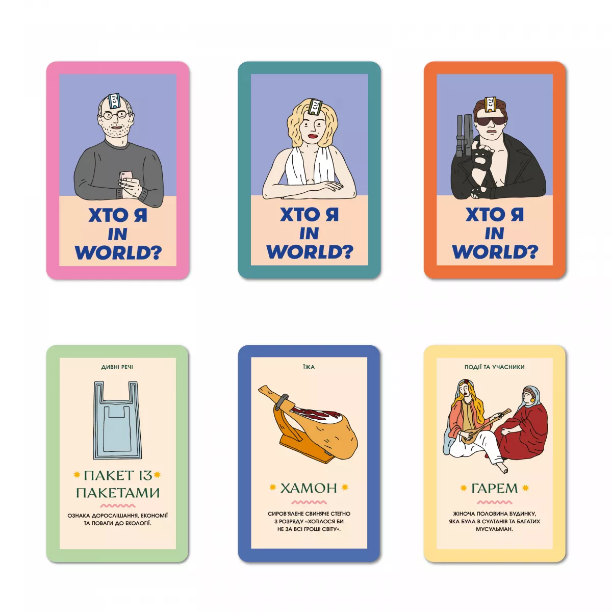 «Хто я in world?» - це настільна гра для вечірки, в якій ви будете відгадувати персонажа чи предмет з карти, яка вам дісталась. Класична забавка для компанії про все найцікавіше у нашому світі. Діалектизми, постаті, пам'ятки архітектури та предмети мистецтва - все це чекає на вас у новій грі з новим вмістом!