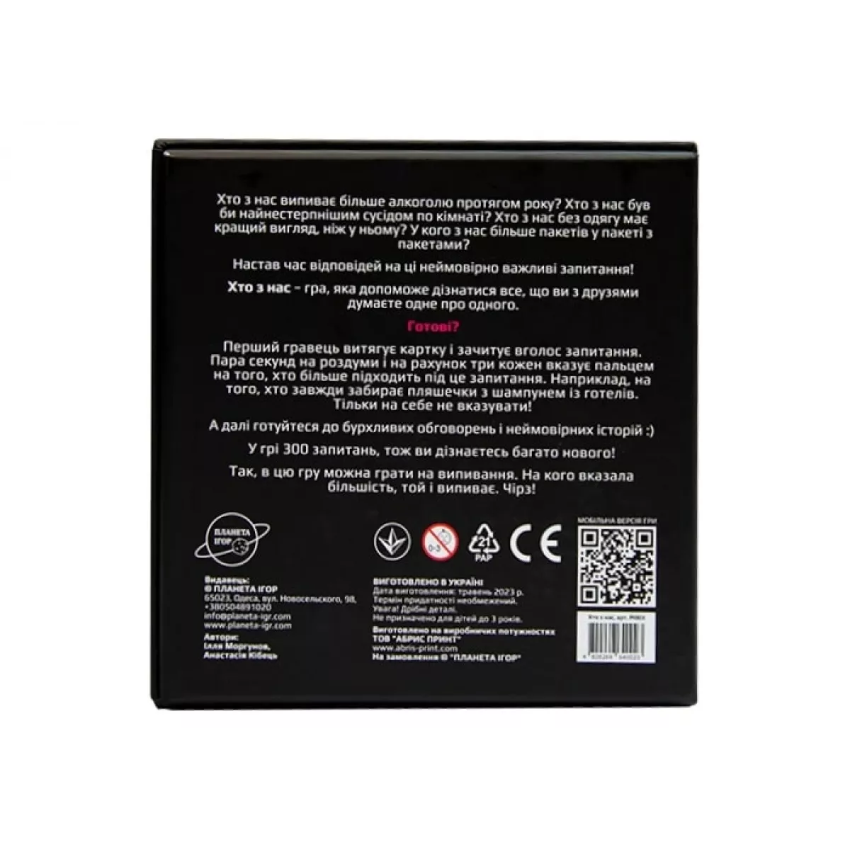 Гра "Хто з нас?" може стати хітом будь-якої вечірки та допоможе дізнатися багато цікавого, шокуючого та нового про друзів. Вона підходить для великих компаній та гарантує позитивні емоції. Для більш пікантної гри, можна вибрати версію гри "Хто з нас? ХОТ", яка містить ще більше відвертих запитань та завдань.