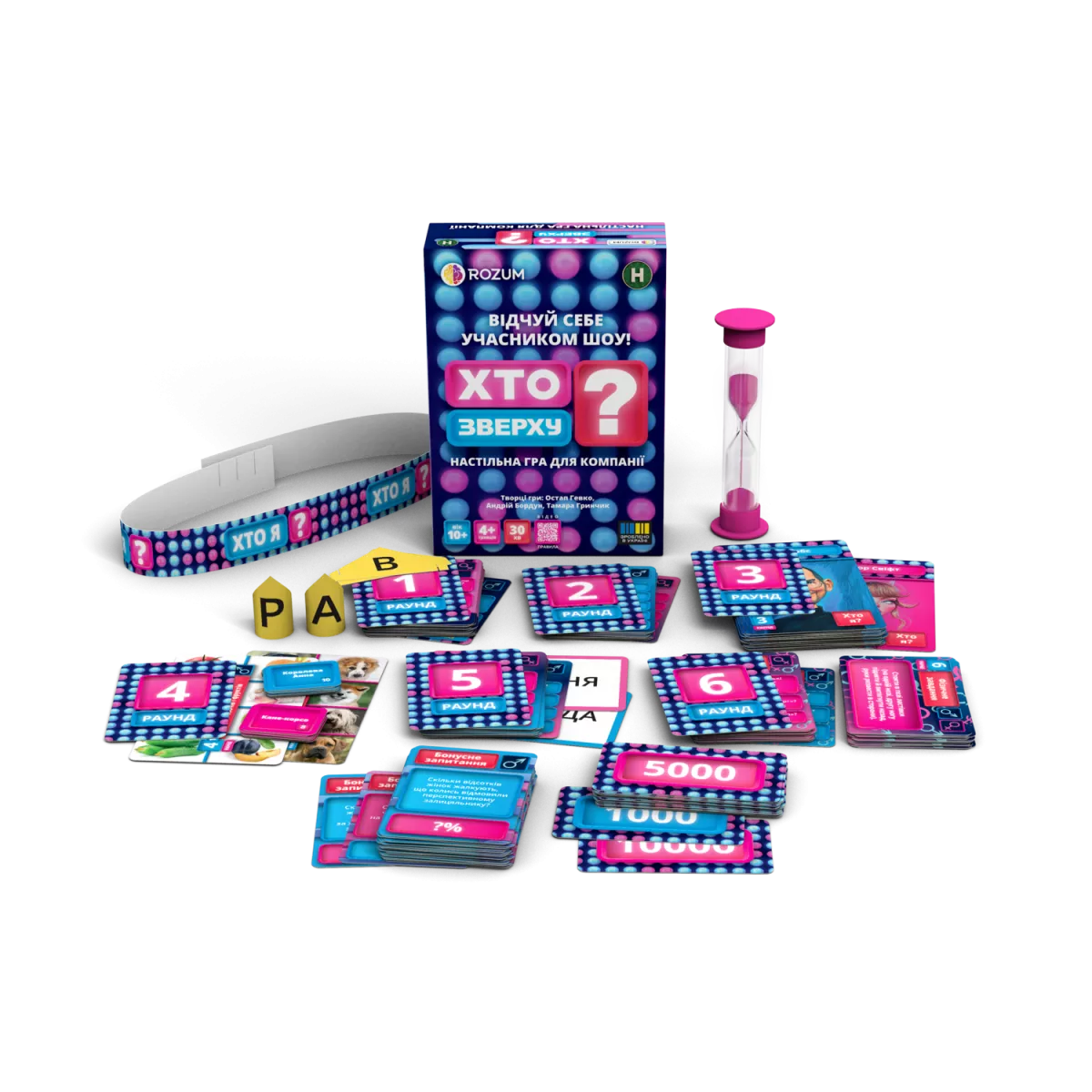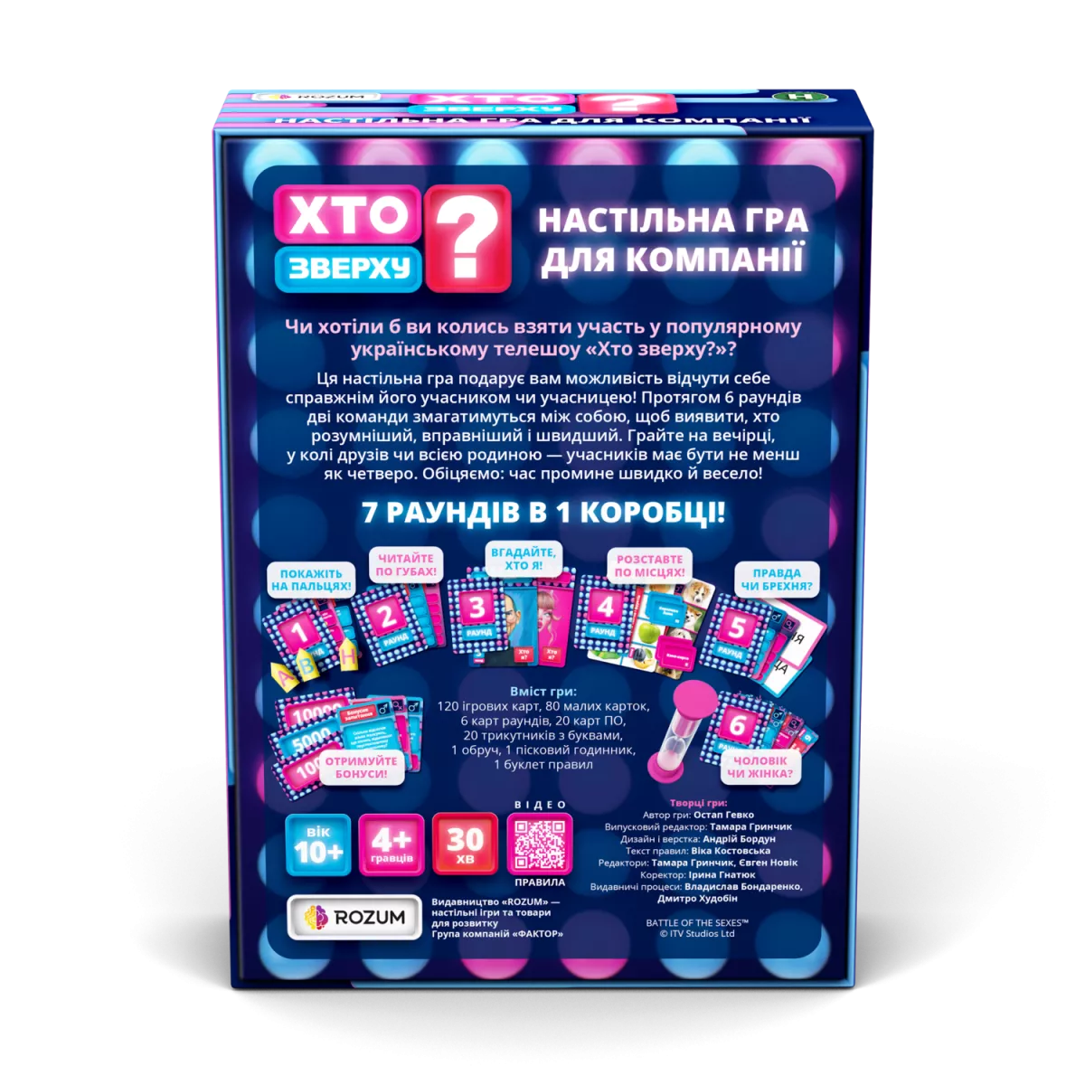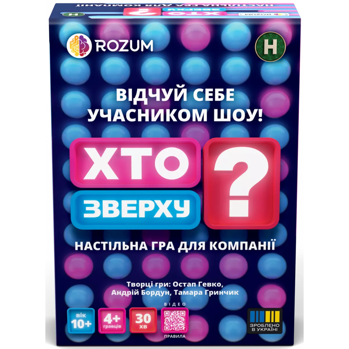«Хто зверху?» — творча командна гра, що є адаптацією популярної телепрограми. Учасники змагаються в дотепних завданнях, відповідають на запитання та демонструють свої вміння й навіть фізичну силу. Гра поєднує найкращі моменти шоу та нові завдання, а також дає змогу додати власні ідеї для конкурсів. Динамічні раунди та веселий суперницький дух гарантують незабутні емоції та гарний настрій для всіх.