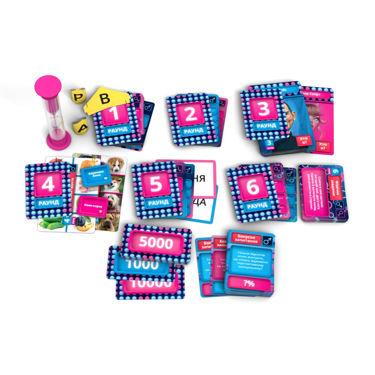 У коробці 6 зіп-пакетів із компонентами для кожного раунду - насадки на пальці, карти завдань, обруч тощо, 20 «банкнот» переможних очок (ПО), 25 карт бонусних запитань, Пісковий годинник