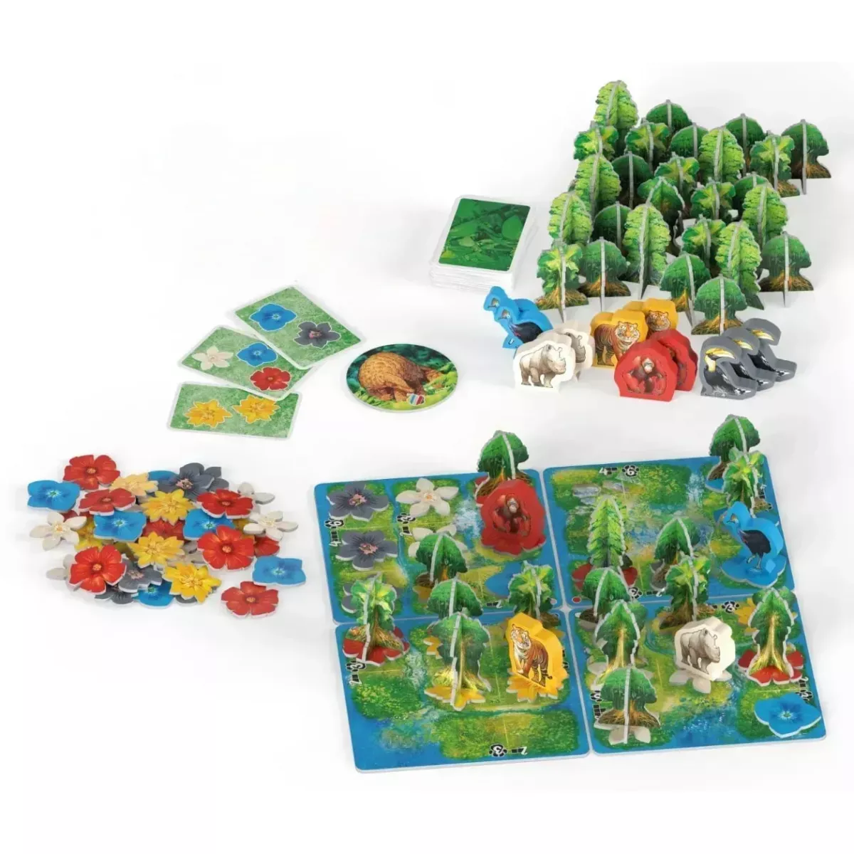 У коробці 16 планшетів тропічного лісу, 130 квітів, 64 дерева, 15 тварин, 1 жетон панґоліна, 70 карт квітів, 24 карти екосистем, 1 блокнот для підрахунку очок, Правила