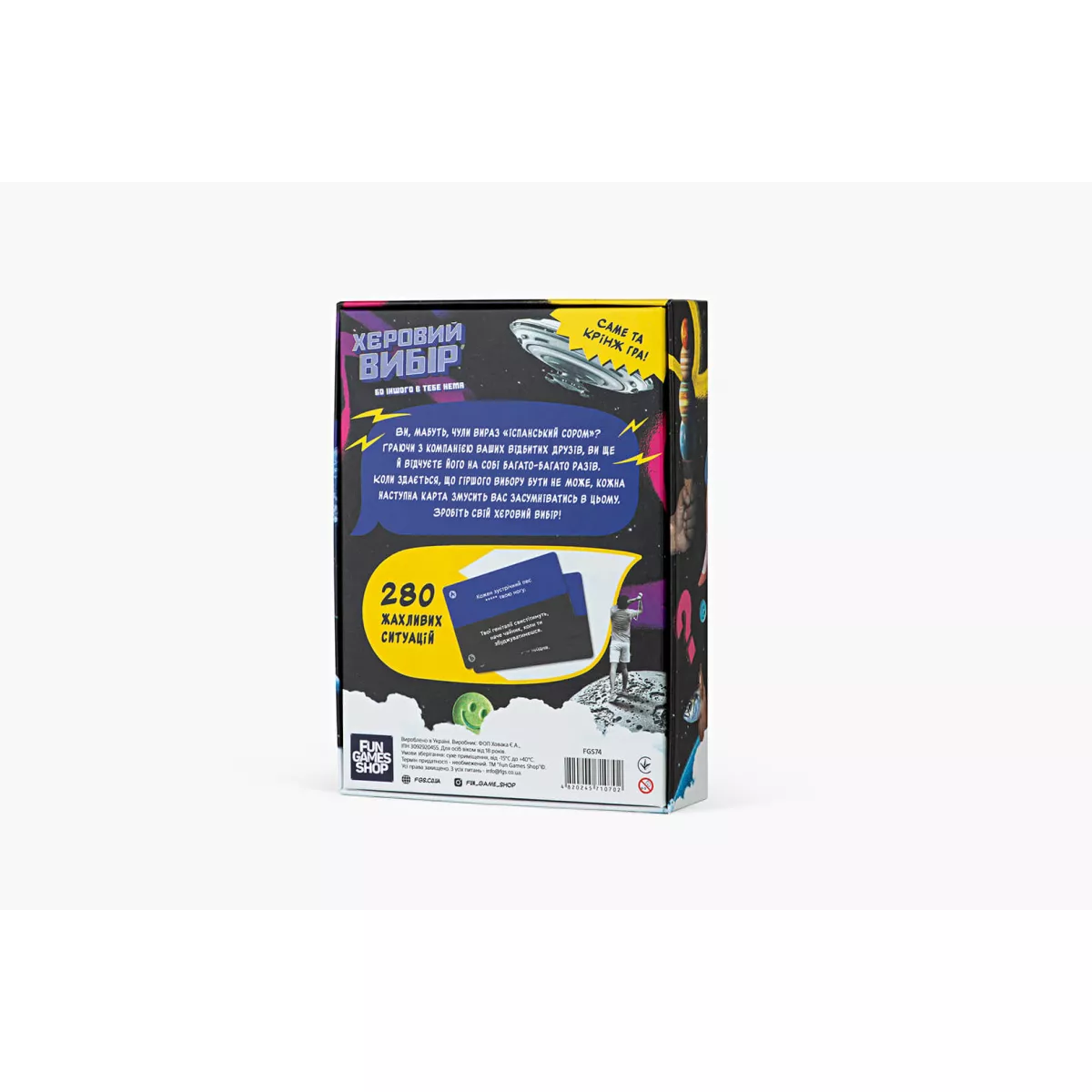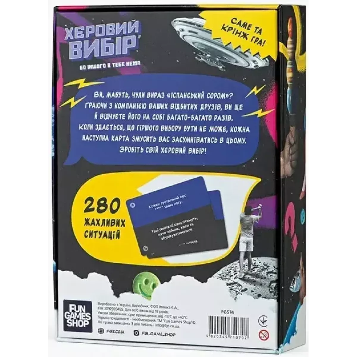 140 карт абсурдних, провокаційних та веселих запитань. Відвертість гри призводить до неочікуваних зізнань. Це перевірка на витримку і почуття гумору. Чи готові ви зробити свій вибір? Спойлер: він буде жахливим.