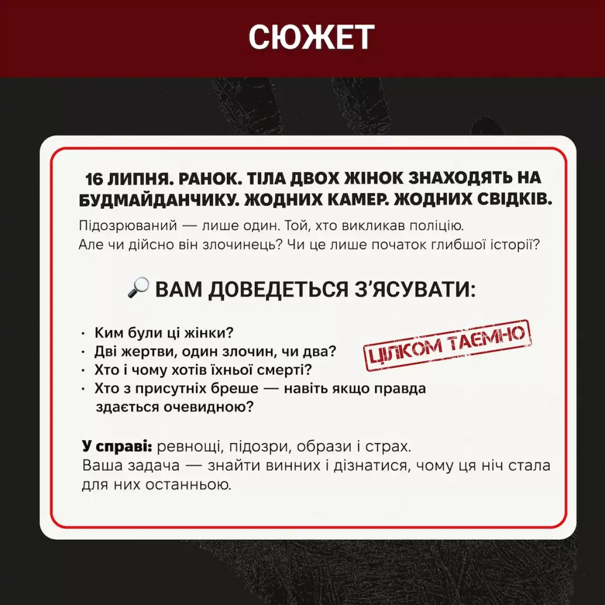 Кривий Ріг, липень 2016 року. Звичайного робочого ранку будівельник натрапляє на жахливу знахідку — тіла двох жінок. Викликавши поліцію, він сам опиняється в ролі головного підозрюваного, на якого так легко повісити злочин. Та ви знаєте, що подвійне вбивство приховує набагато глибшу й темнішу історію.