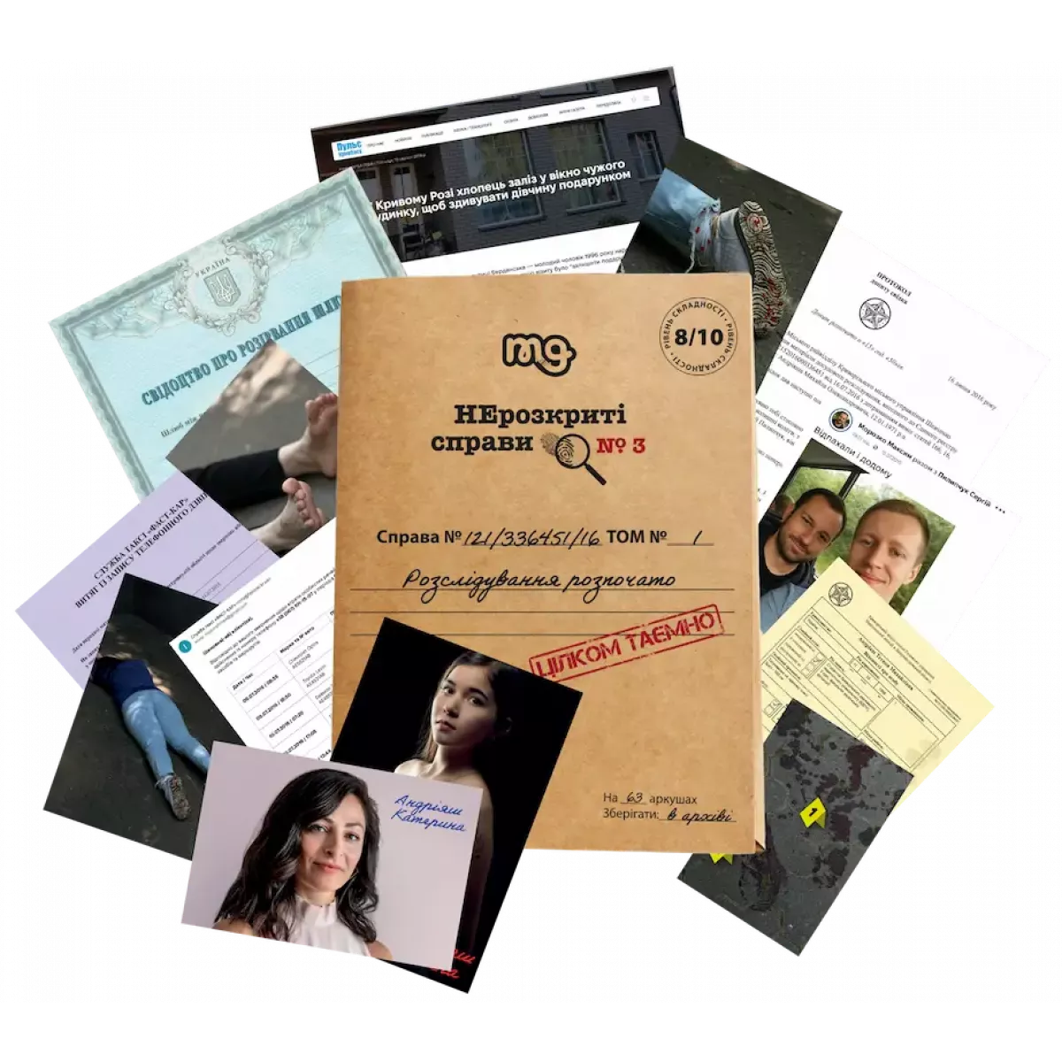 «Нерозкриті справи #3» — детективна настільна гра, що занурює у справжнє розслідування. На вас чекає продумана до деталей справа про подвійне вбивство з рекордною кількістю матеріалів: понад 70 документів, серед яких протоколи допитів, фотографії з місця злочину, записи розмов, експертизи, листи й квитанції.