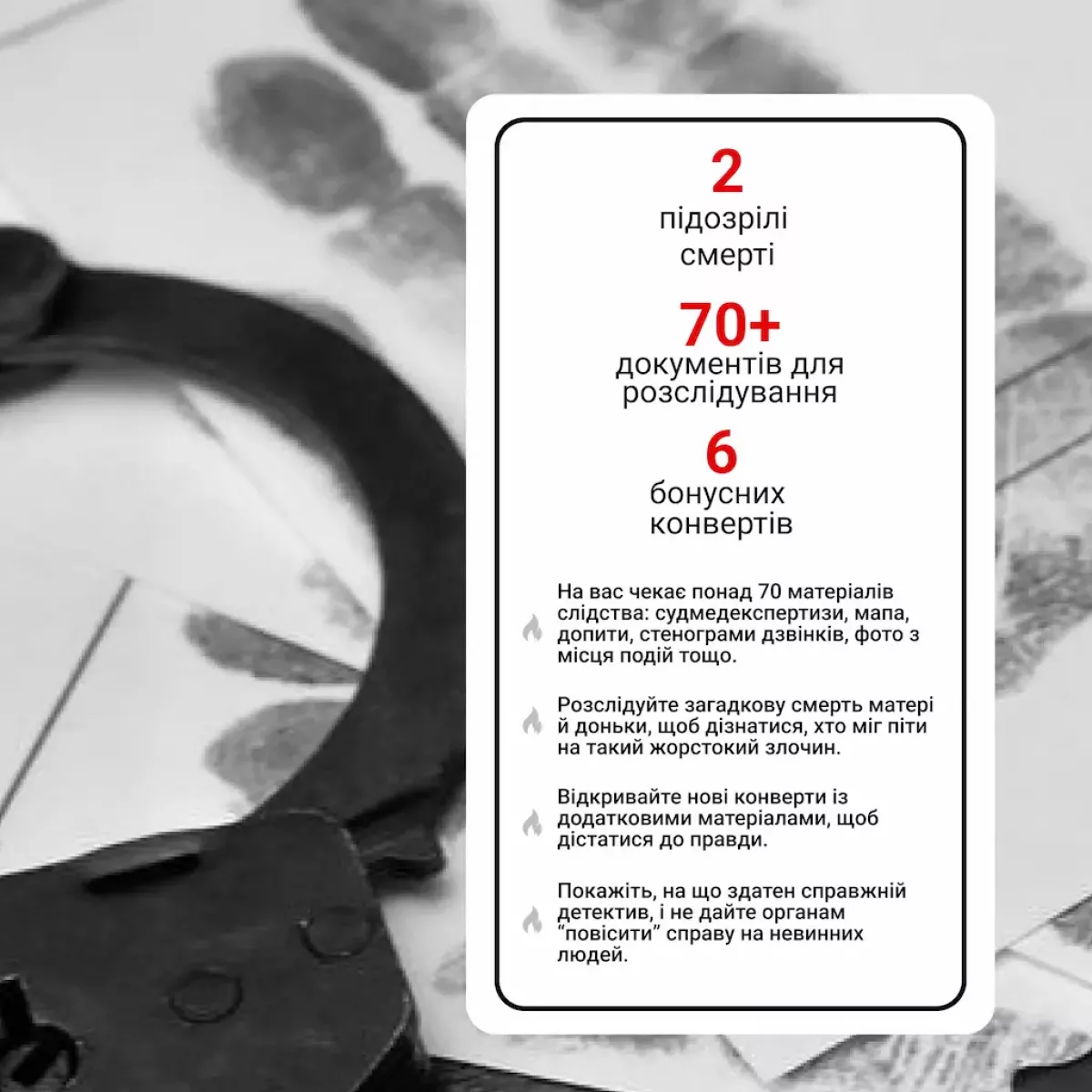 У центрі — емоційний напружений сюжет: заплутаний сімейний конфлікт і приховані драми. Знайдіть істину, відтворіть хронологію і визначте справжнього злочинця.