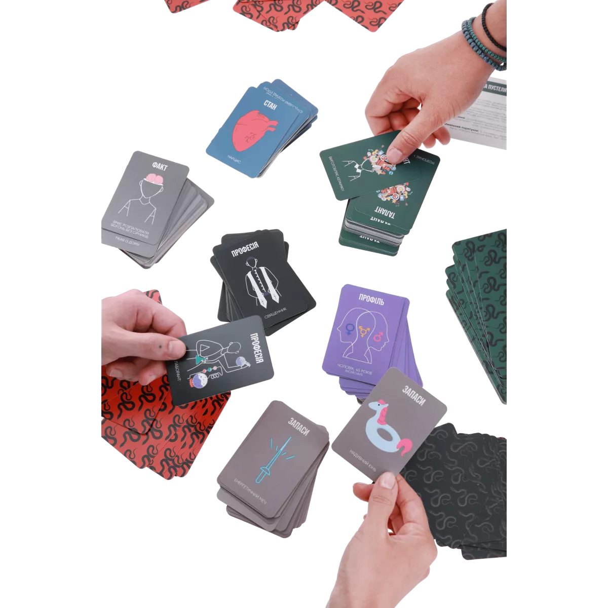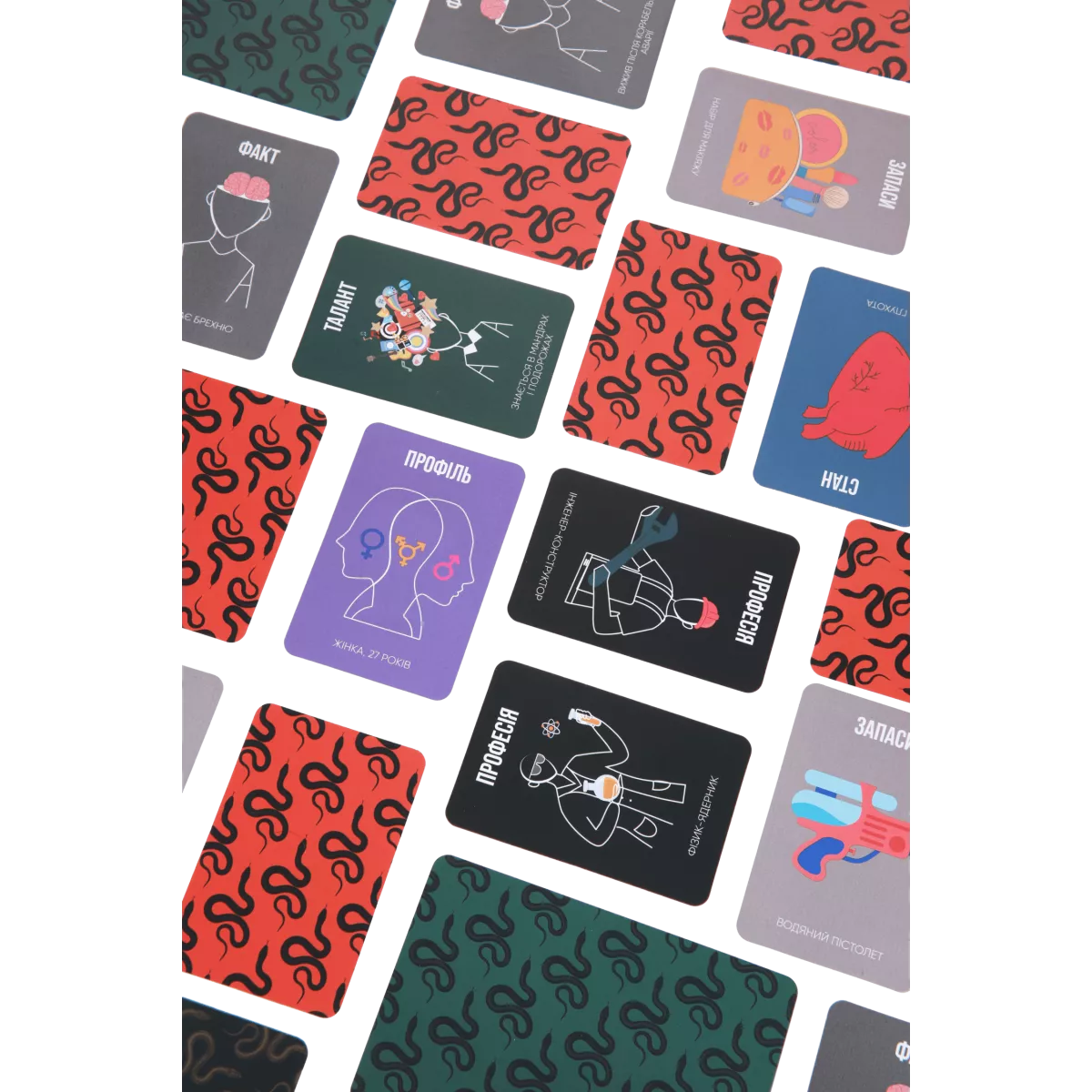 У коробці 470 тематичних карток (Професії, Факти, Таланти, Стан здоров’я, Таємниці, Знахідки тощо), 50 сценаріїв для гри
