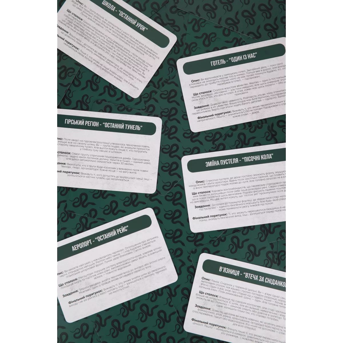 50 сценаріїв: кінець світу, ізоляція, містичні події та інші кризові ситуації. Карти професій, профілів, фактів, талантів, запасів, стану здоров’я, таємниць і знахідок. Вони можуть стати вашою перевагою або зруйнувати вашу репутацію.