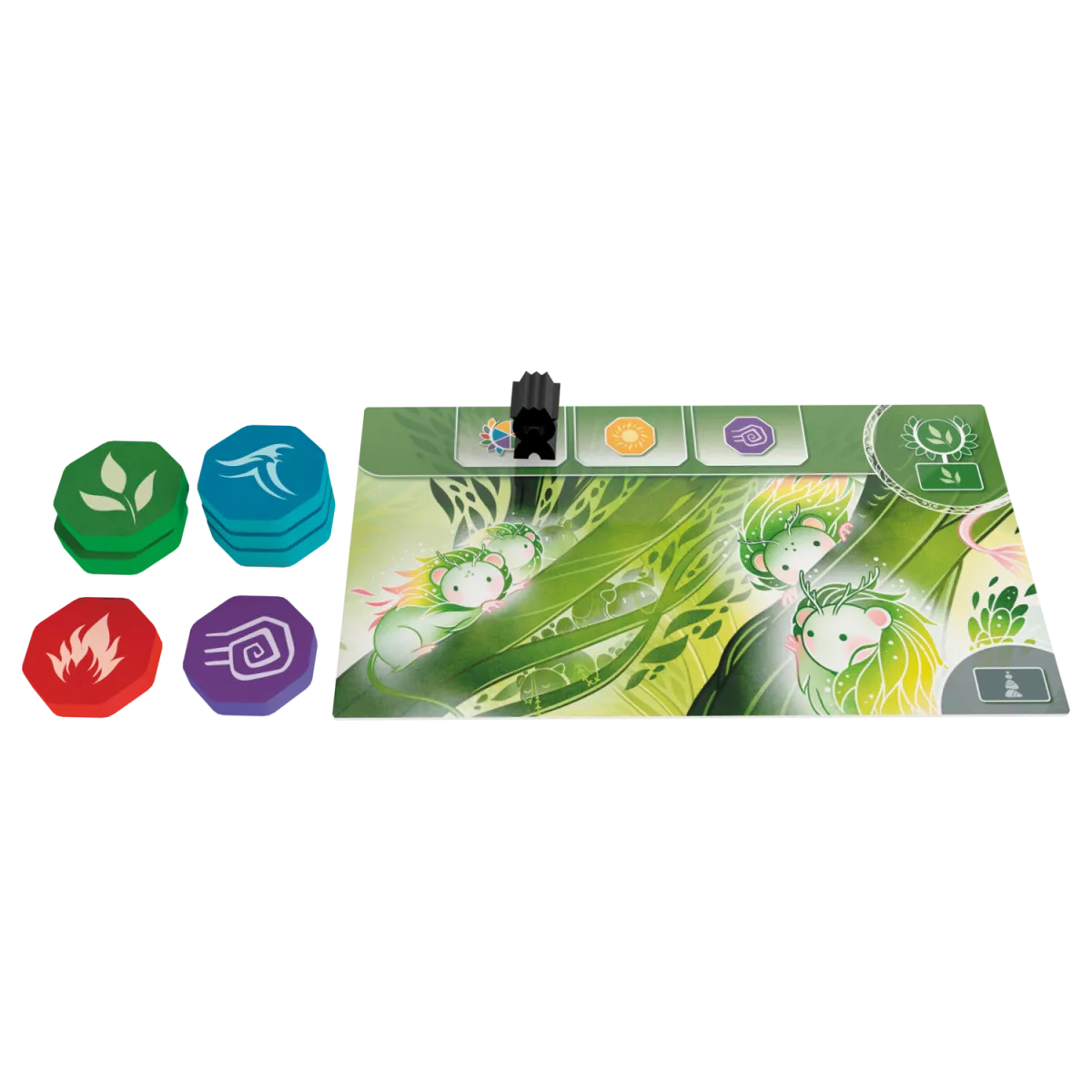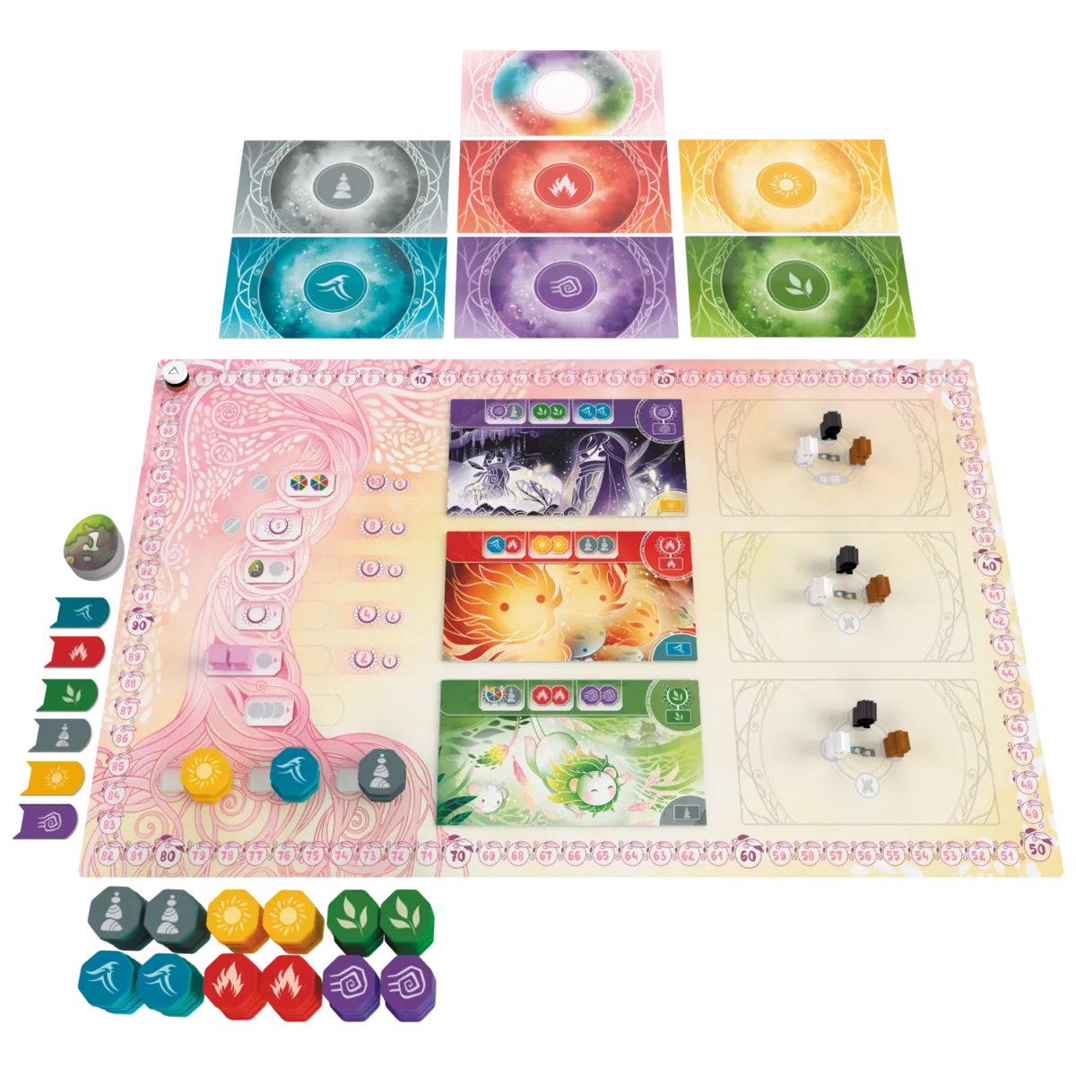 У коробці 1 ігрове поле, 90 жетонів прихильності (по 15 кожного з 6 кольорів духів), 15 жетонів рун, 6 двосторонніх плиток вівтаря (по 1 кожного з 6 кольорів духів), 12 початкових карт, 6 карт зміни пір року, 36 карт мандрівки (по 6 кожного з 6 кольорів духів), 2 нейтральні фішки старійшин, 4 маркери очок (по 1 на гравця), 28 фішок старійшин (по 7 на гравця), 4 плитки гравців (по 1 на гравця), правила