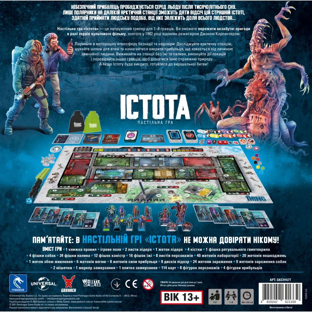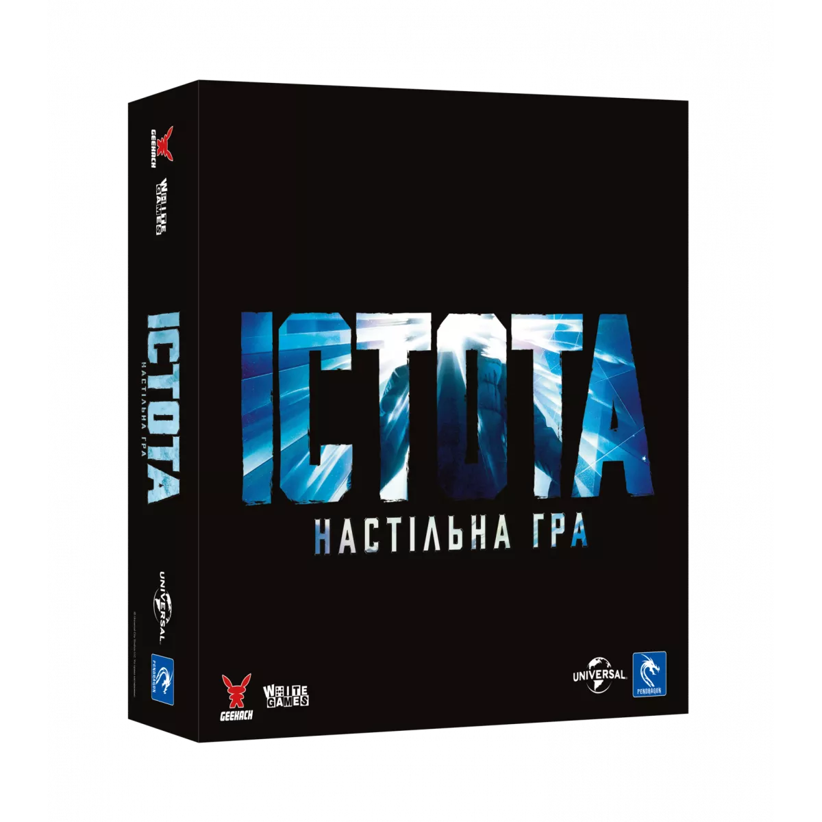 Полярна станція, пронизливий льодяний вітер, нестача їжі, палива, тепла, електроенергії… Ситуація і без того виглядає не дуже оптимістично для дослідників, які опинилися у пастці на цій станції, так ще й інопланетна істота захопила одного з них і тепер намагається дістатися до зовнішнього світу, що стане кінцем всього людства… Істота. Настільна гра (The Thing: The Boardgame) це напівкооперативна пригода для 1-8 гравців, заснована на фільмі Джона Карпентера «The Thing» 1982-го року, у якій гравці візьмуть на себе роль або дослідників, які намагаються вижити, або інопланетянина, який є загрозою для всіх. Люди мають чимало причин для життя, але перед ними постане ще більше перешкод… Чекаючи евакуаційний гелікоптер всім гравцям необхідно співпрацювати разом, аби опалювати відсіки, живити електрогенератор і відбиватися від оскаженілих псів. Ще й Істота усіляко намагатиметься саботувати роботу, проте це відбувається таємно, тож виявляти зрадника необхідно дедуктивним методом під час спільних обговорень. Ну і вдвох роботу виконати швидше та легше, але це несе й неочікувані загрози… Постійна недовіра витає у повітрі Зараженим Істотою може виявитися будь-хто з команди, а разом з тим, якщо інопланетянин співпрацював разом із здоровою людиною, то він також міг стати зараженим і поміняти сторону конфлікту! Виявити це можна лише за допомогою тесту крові, але таких медичних засобів вкрай мало і вони не гарантують, що дослідник не заразиться після цього. Життя – це вже чимала винагорода! Люди виграють у партії лише у тому випадку, коли вони зможуть врятуватися на гелікоптері зі станції. Та найважливіше, щоб серед врятованих не причаївся інопланетянин, адже тоді весь рід людський буде під загрозою. Істота ж виграє, якщо разом з людьми втече зі станції, не дасть втекти нікому або доведе до смерті (від холоду, або у власному шлунку) дослідників. Тож якщо вам до смаку ігри з прихованими ролями, де на розвиток подій впливають не тільки вчинки гравців, а й купа інших факторів, таких як агресивні вороги, сувора погода та невблаганний випадок – обов’язково придбайте у свою колекцію коробочку Істота. Настільна гра. А ще більше підозр та недовіри вас чекає у грі Кімната 25, у якій небезпечний комплекс з купою пасток стане в’язницею для гравців.