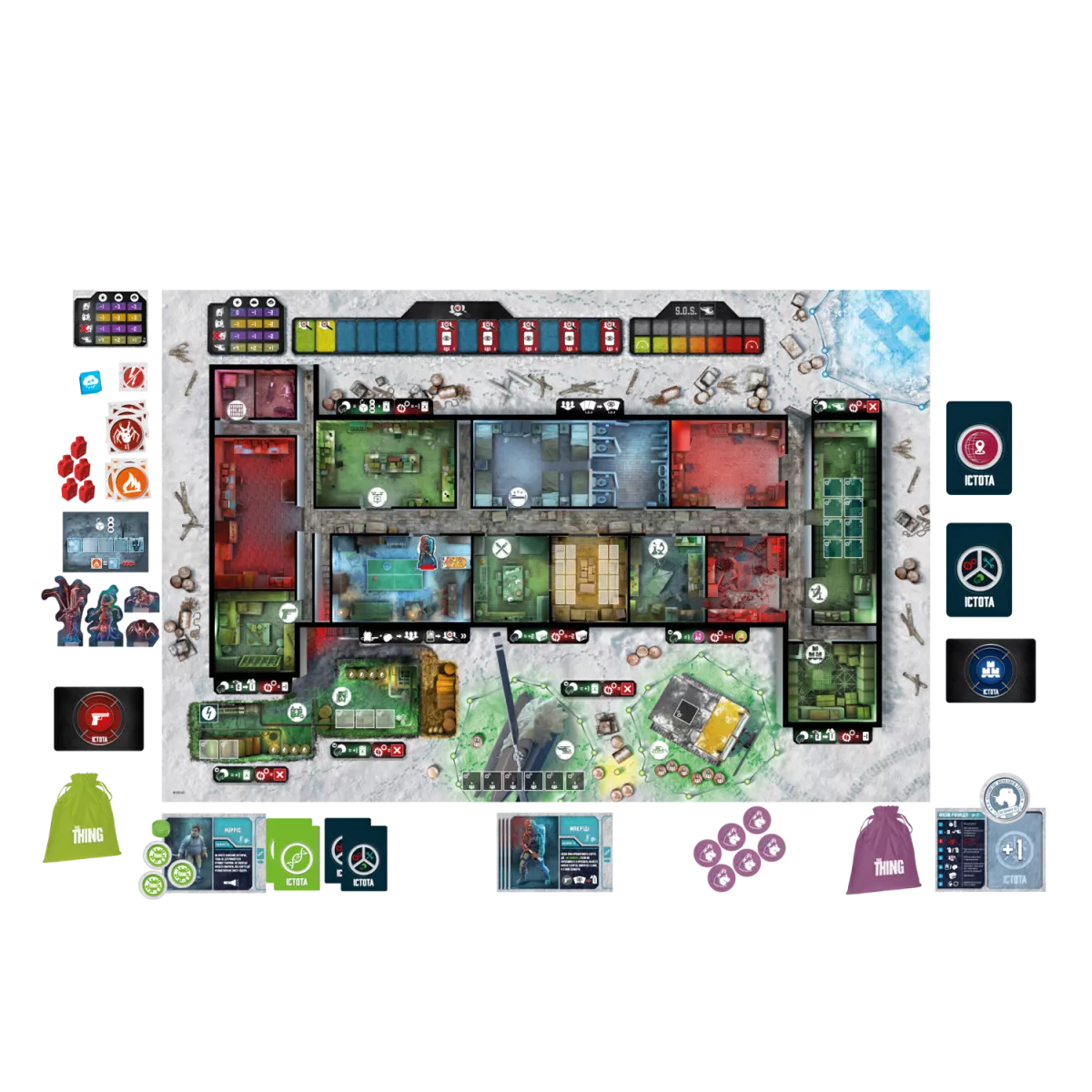 У коробці 1 книжка правил, ігрове поле , 2 листи лідера , 1 жетон лідера , 4 кістки , 1 фішка рятувального гвинтокрила, 4 фішки собак , 34 фішки палива , 12 фішок каністр , 16 фішок їжі , 8 листів персонажів , 40 жетонів лабораторії , 20 жетонів пошкоджень, 1 жетон збою живлення , 6 жетонів вогню , 8 жетонів сили прибульця , 8 дисків підозр , 24 жетони зараження , 9 жетонів зараження собак, 2 мішечки , 1 маркер замерзання , 1 плитка замерзання , 8 фігурок персонажів , 4 фігурки прибульців