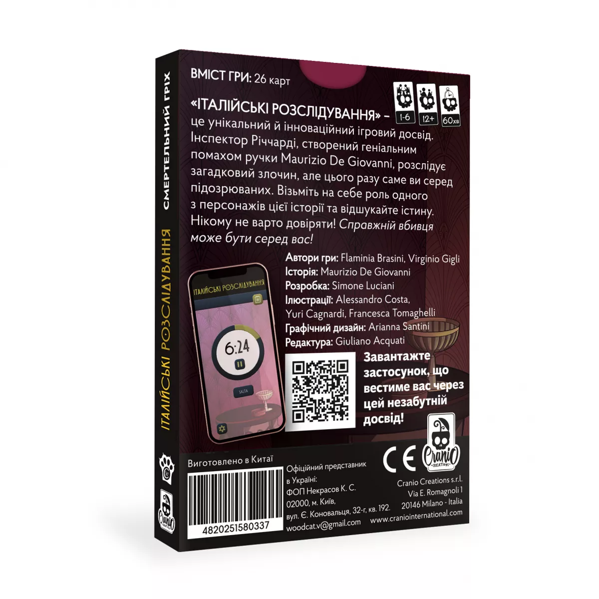 «Італійські розслідування: Смертельний гріх» – друга справа у серії захопливих карткових детективів. Гравцям належить взяти на себе ролі підозрюваних у моторошному вбивстві графа. Використовуючи логіку, дедукцію та уважне вивчення доказів, учасники повинні розплутати клубок інтриг та виявити справжнього вбивцю.