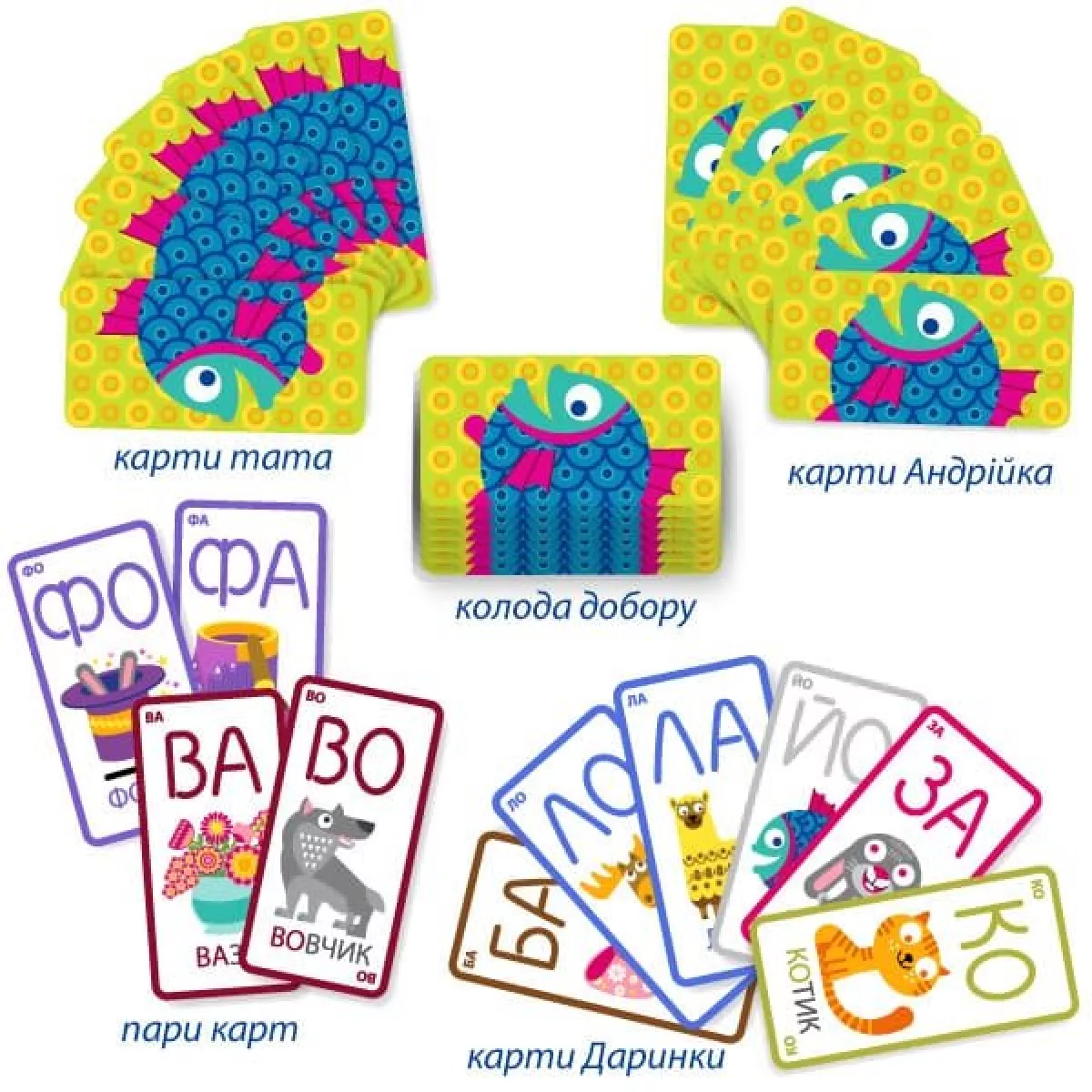 Дорослий-ведучий роздає гравцям по 6 карт. Колода з іншими картами кладеться в центрі столу. Всі гравці скидають пари карт з однаковими приголосними, читаючи їх.