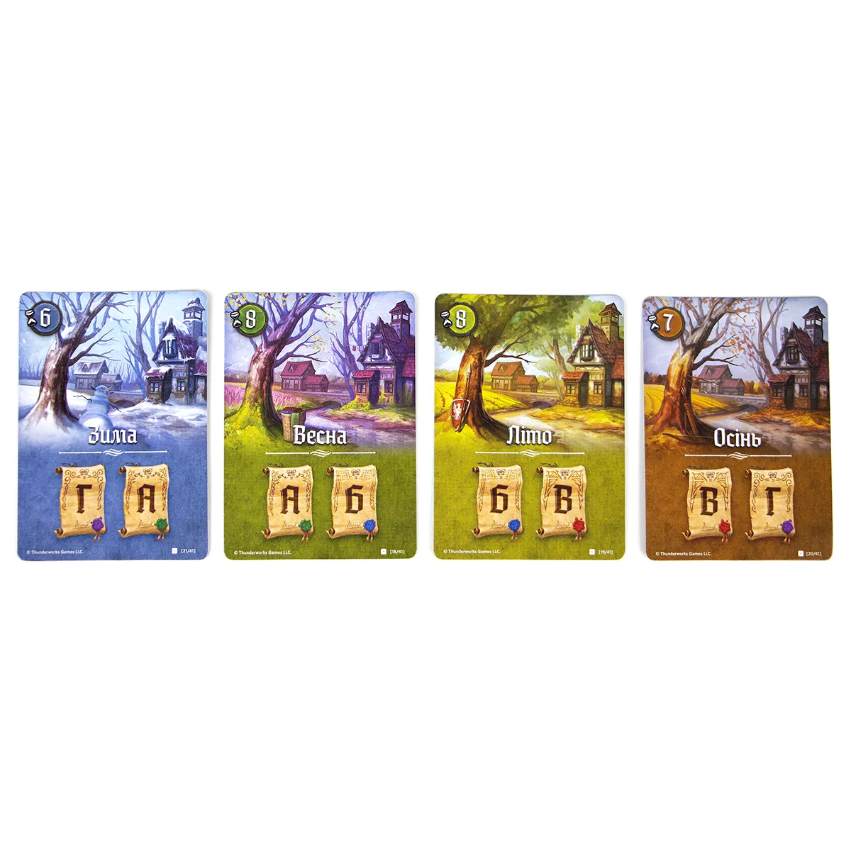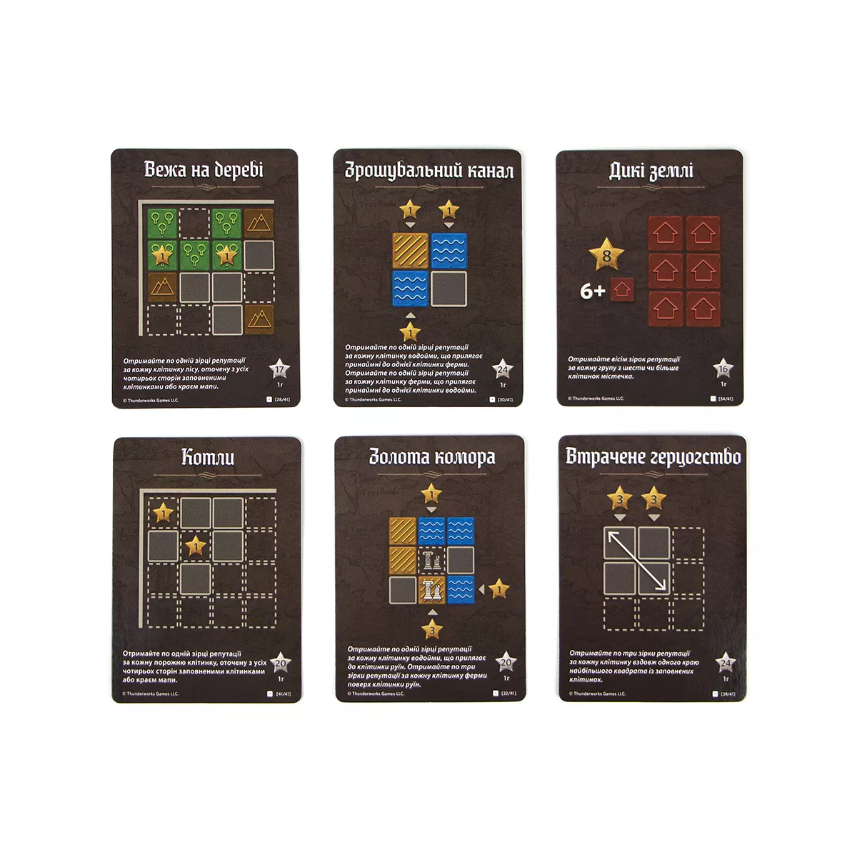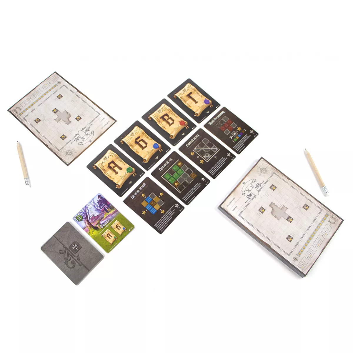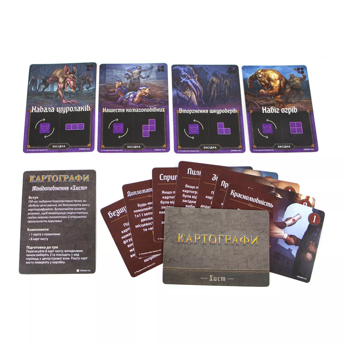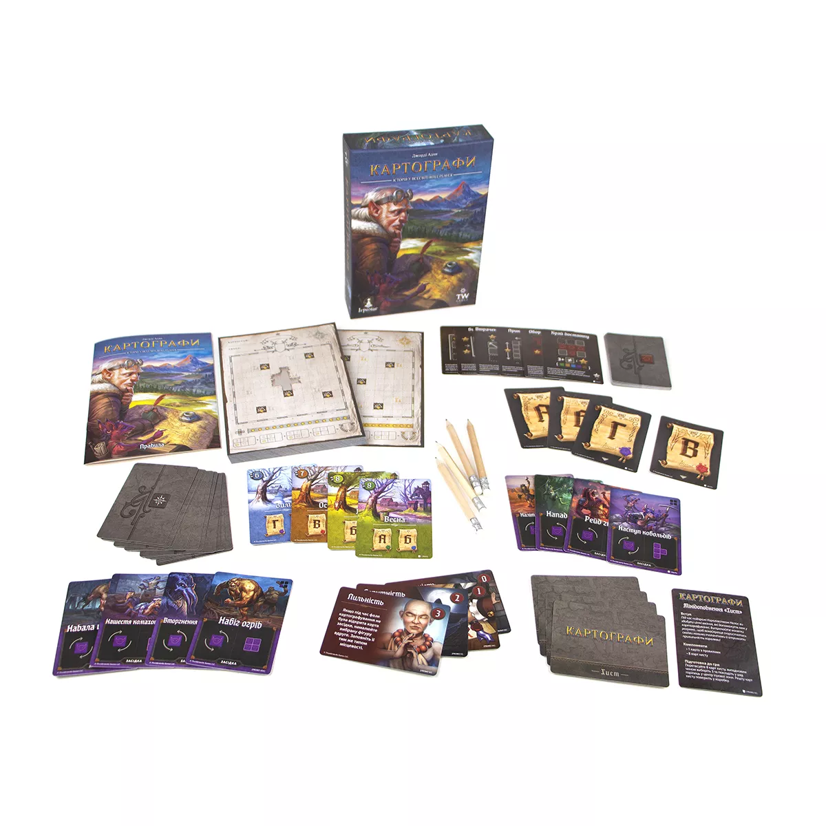 У коробці 1 журнал картографа (100 двобічних аркушів мап), 16 карт підрахунку репутації, 13 карт досліджень, 4 карти засідок, 4 карти сезонів, 4 карти указів, 8 карт хисту, 4 промокарти засідок, 4 олівці, правила гри