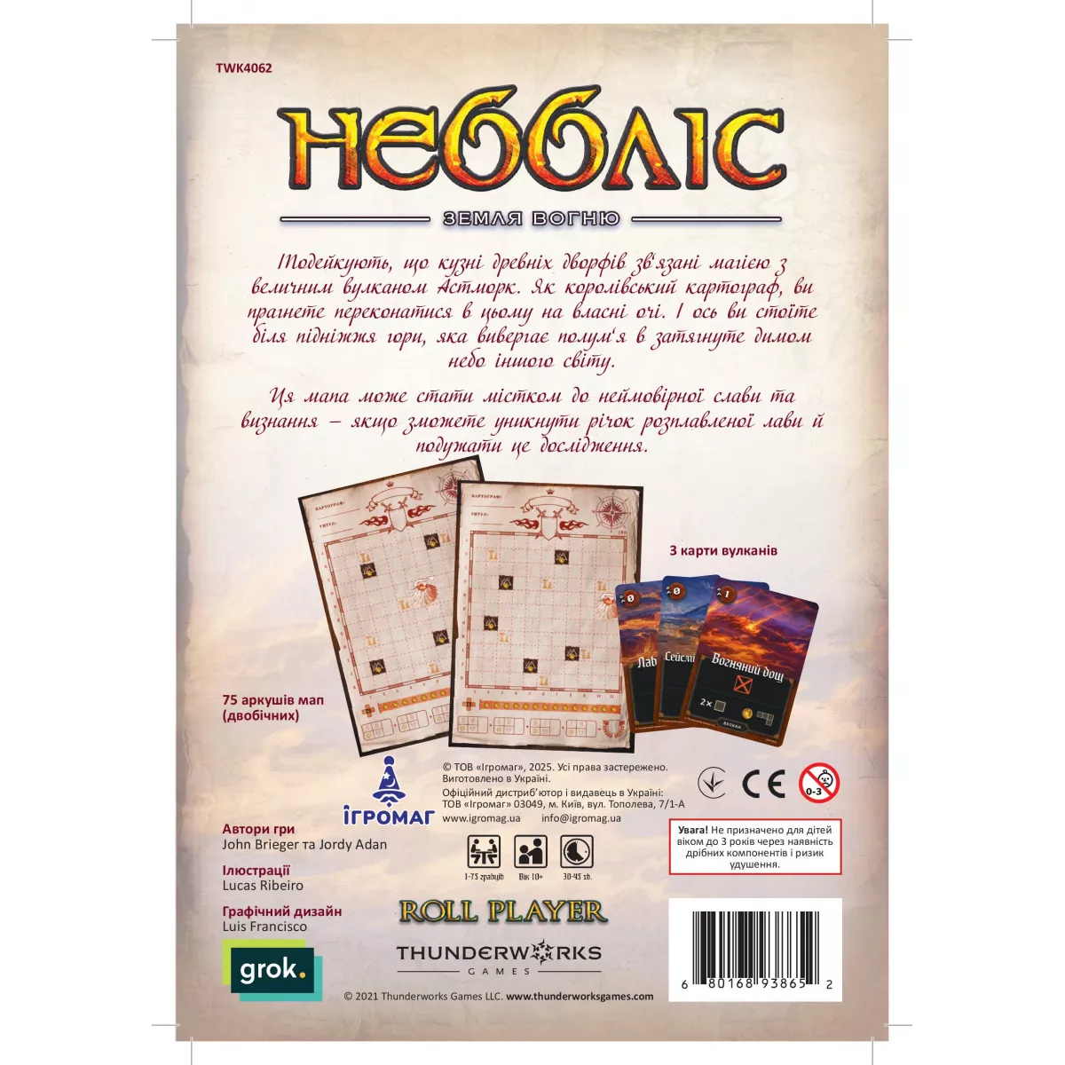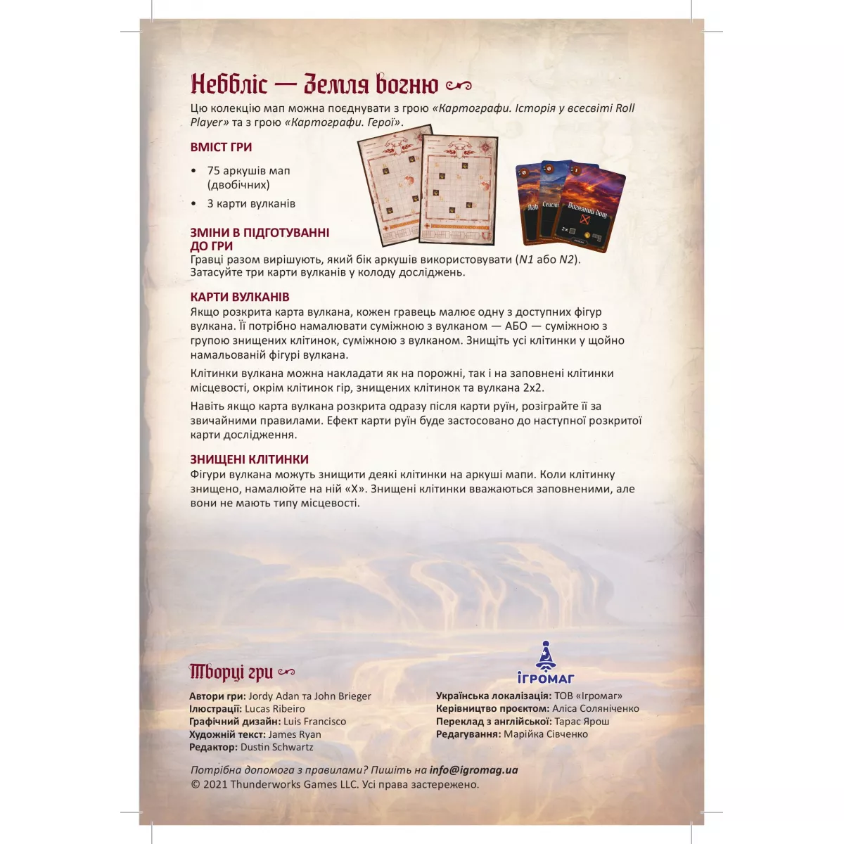 У світі, де кожний новий шлях і кожна відкрита територія мають значення, ваша роль картографа стає вирішальною. Ваше завдання — заповнити мапу, враховуючи укази королеви Гімнакс і уникаючи засідки монстрів. З "Набором мап 1 – Неббліс. Земля вогню" ви отримаєте нові інструменти та нові виклики для демонстрації своєї майстерності. Розширюйте свої володіння, захищайтеся від небезпек і прагніть отримати максимальну кількість переможних очок.