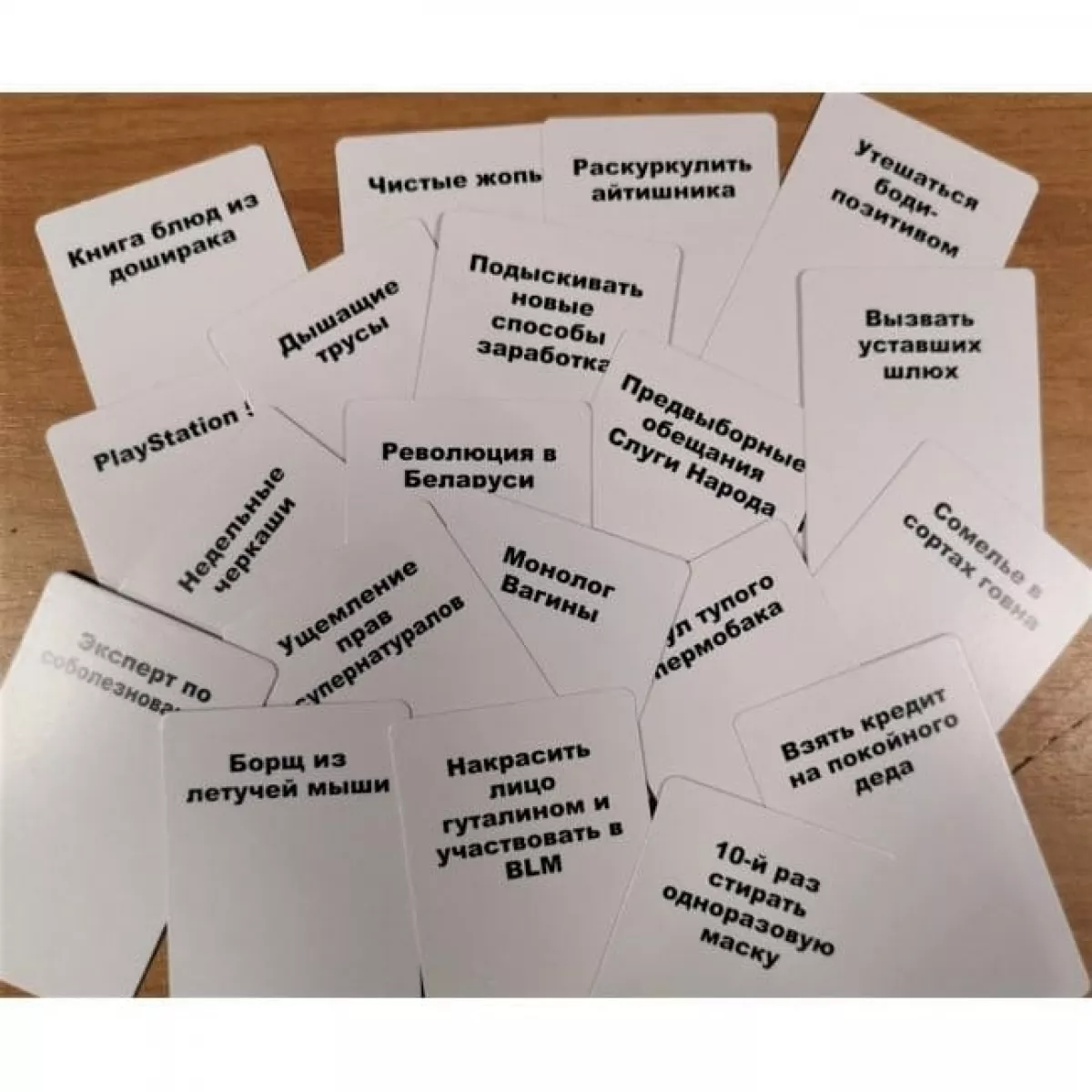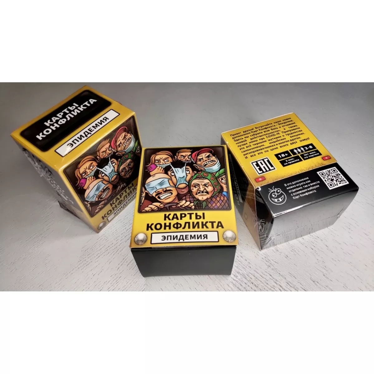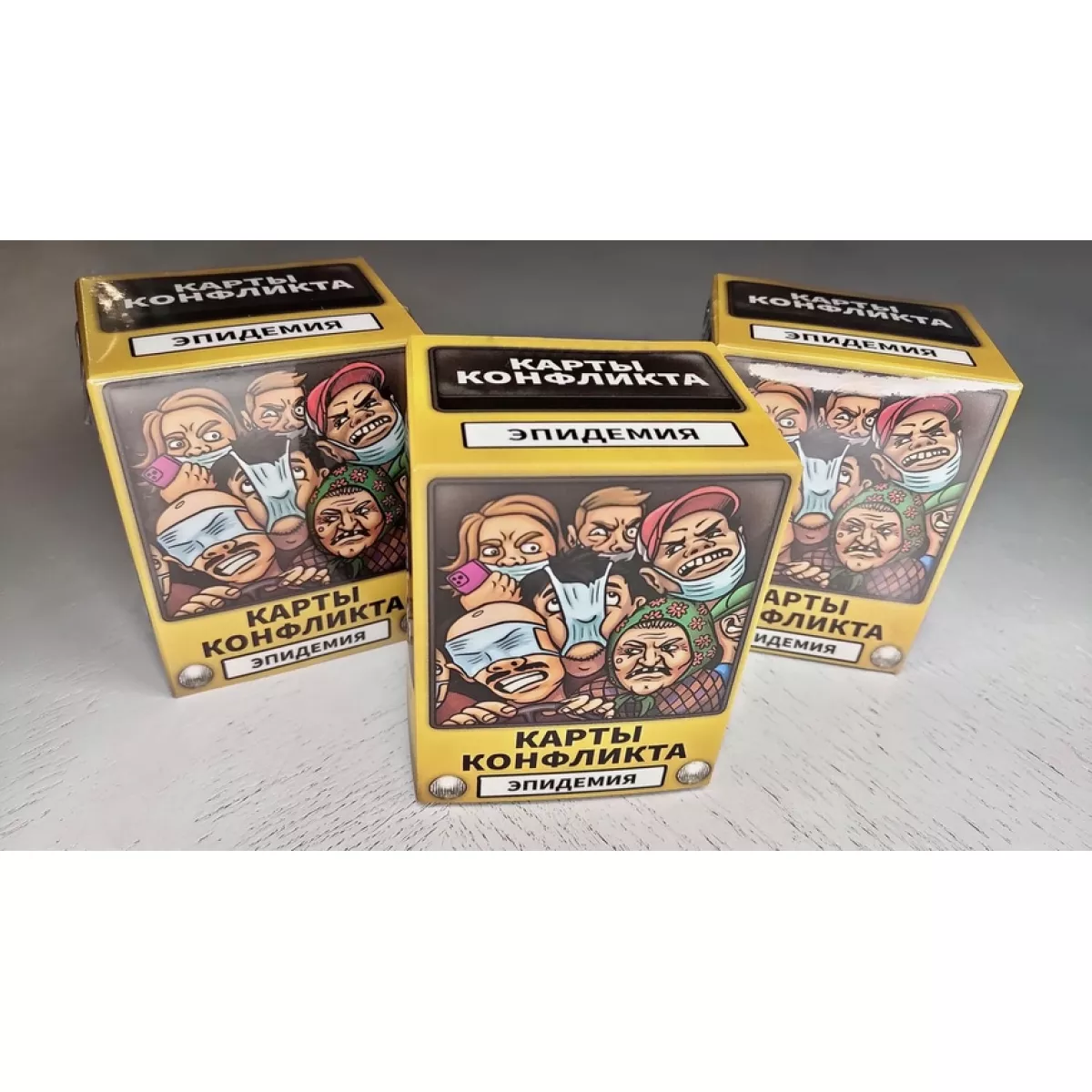 Карти Конфлікту Епідемія. Доповнення №3. (18+) Зустрічайте нове самостійне доповнення до пекельно хітової гри Карти конфлікту! "У світі є дві нескінченні суті - всесвіт і людська дурість, але на рахунок всесвіту я не впевнений." Це якось сказав Ейнштейн. Ми ж говоримо, що людська тупість може бути чертовски смішний. Гра Карти Конфлікту Епідемія, натхненна затяжний і невтішної боротьбою народу з карантинним неробством, і наповнена повною нісенітницею, з якої вашим креативним умам належить народити наскільки тупі настільки і смішні фрази. Правила ті ж. Чим смішніше ваши перли, тим ближче перемога! У набір входить 180 нових карт: 150 білих (відповіді) і 30 чорних (питання). Карти знаходяться в твердій коробці з правилами всередині.