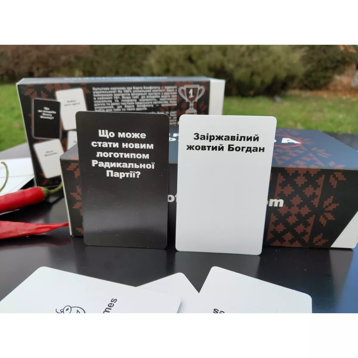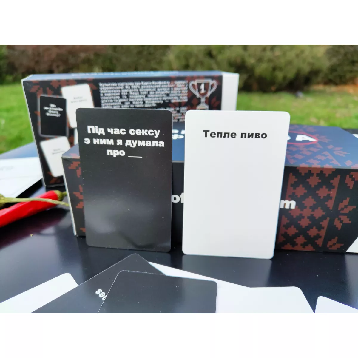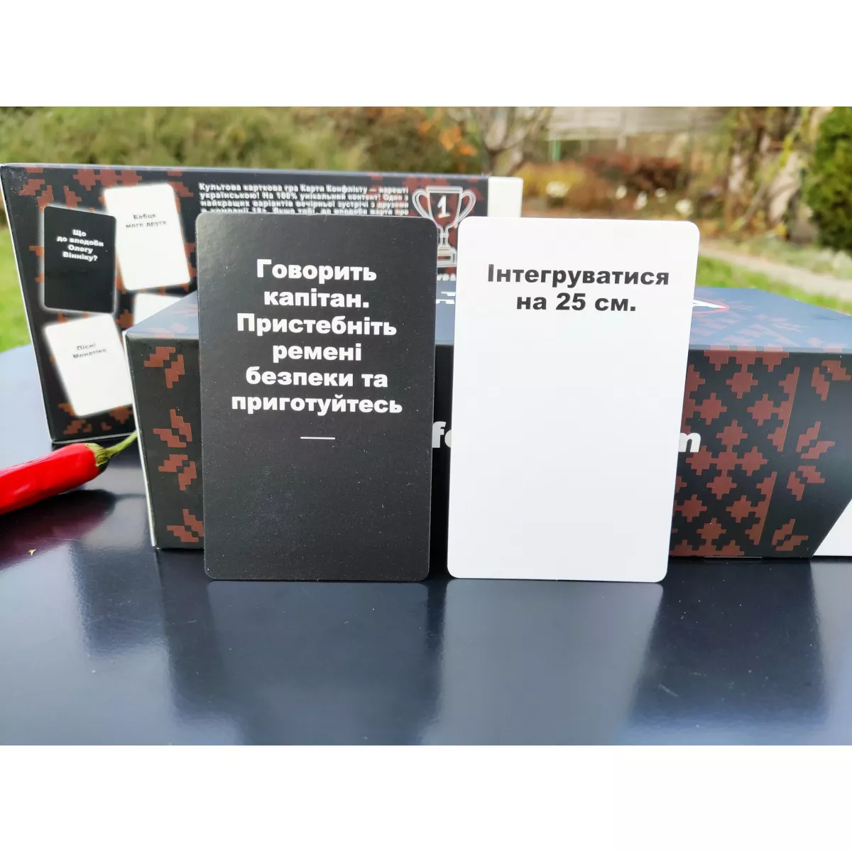"Карти конфлікту UA" — це настільна гра, абсолютно беззаперечна в своїй безглуздості і непристойності, особливо в новому вигляді з українським колоритом! "Карти конфлікту UA" призначені для тих, хто любить жарти про соціальні й політичні проблеми, гумор на межі, і питання, які можуть викликати дискусії. Тут можна поговорити про українську музику чи політику, або навіть задати питання про с*ксуальні уподобання. Гра не для всіх, але для тих, хто готовий до відвертості та відсутності меж.