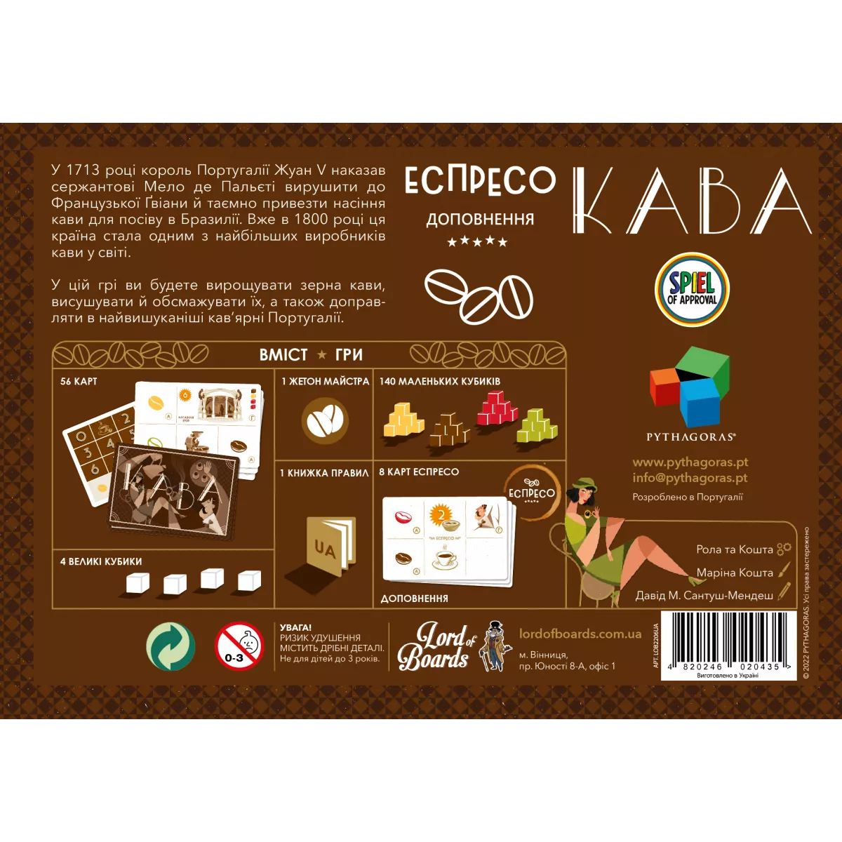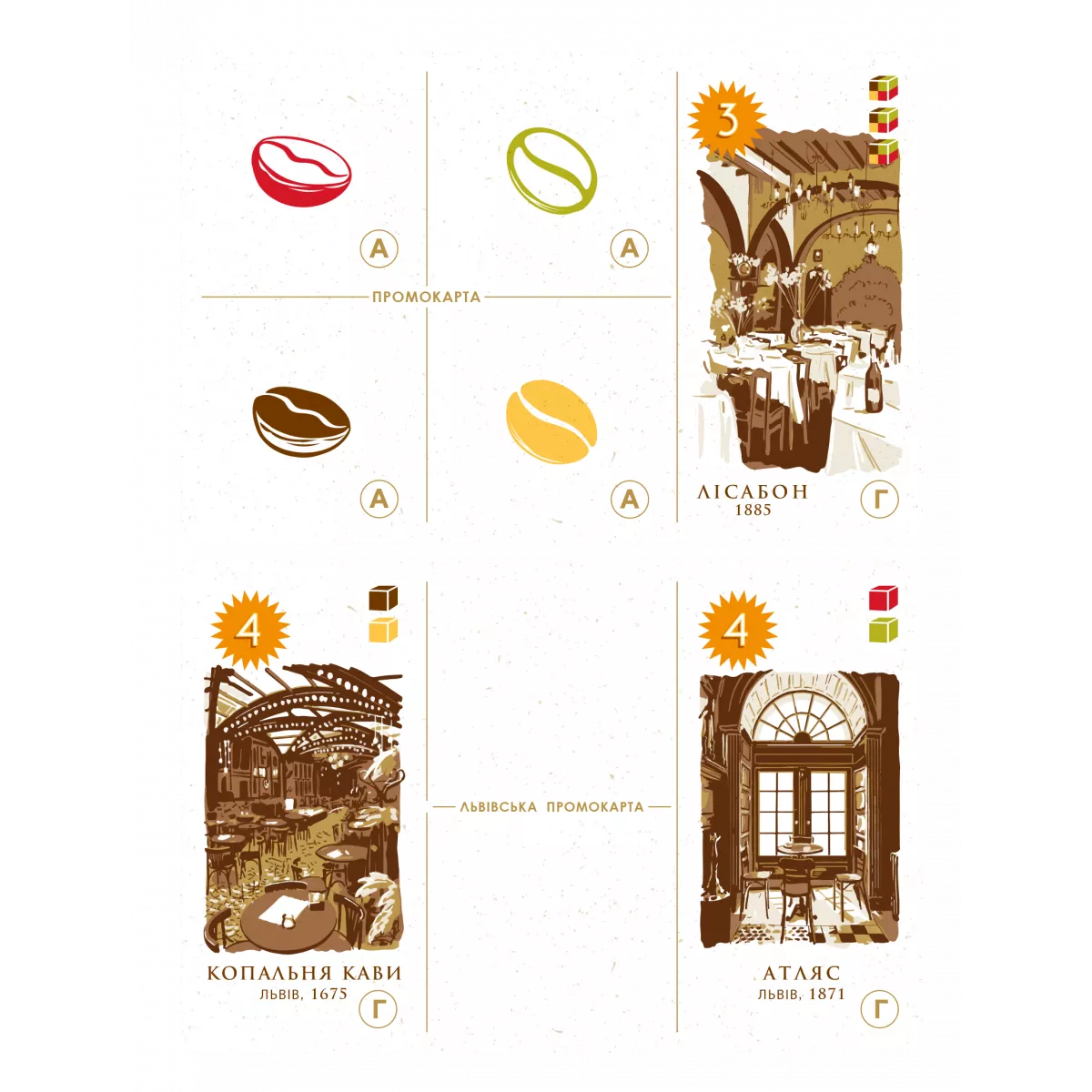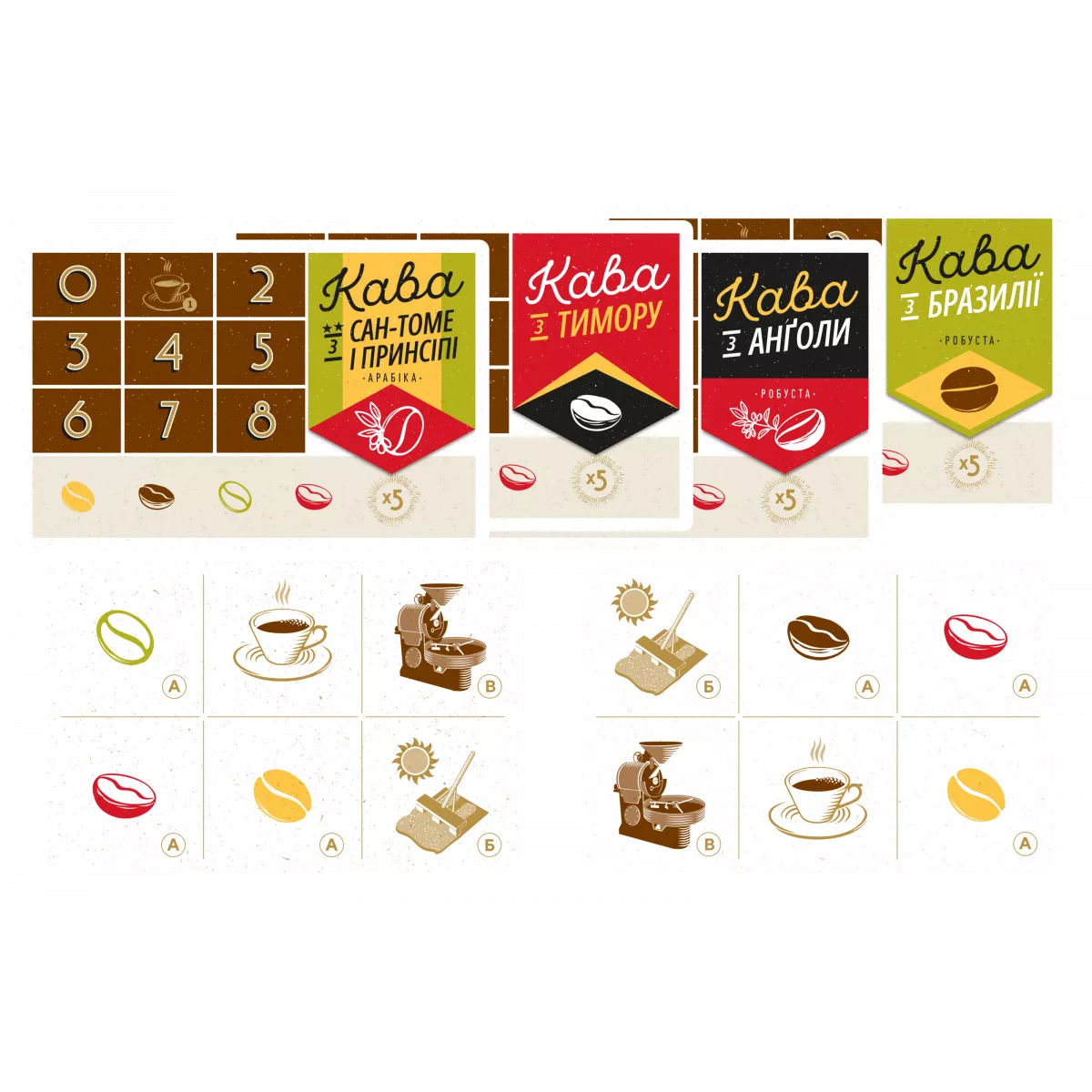 Кава – вишуканий напій, який має своїх прихильників по усьому світу. Коли ви вранці насолоджуєтесь горнятком кави, навіть не задумуєтесь про те, який шлях подолали зерна до того, як опинитись на вашому столі. Настільна гра Кава (Cafe) дозволить вам у цікавому форматі зануритись в історію завезення кавових зерен з Південної Америки до Європи. Ця честь належить португальцям, які після колонізації Бразилії у XVIII столітті налагодили перший успішний маршрут постачання кави. З того моменту латиноамериканська країна стала лідером з виробництва кавових зерен і не втрачає цих позицій до сьогодні, хоча вже й стала незалежною країною. Виконуйте дії, вирощуйте та доставляйте каву У грі Кава кожен учасник перевтілиться у власника кавової компанії. Його завдання – налагодити ланцюги поставок кави з бразильських плантацій до Європи, створити розгалужену мережу, продавати продукцію якомога більшій кількості споживачів. Виконання цієї задачі потребує неабиякого планування та стратегічного мислення. Учасниками протистояння кавових майстрів можуть стати 1-4 гравці віком від семи років, тривалість однієї партії – 20-40 хвилин. Протягом восьми раундів учасники мають прокачати виробництво кави, побудувати чітку систему доставки та продажу кавових зерен. Кожен гравець на початку гри отримує планшет свого бізнесу, картку дій, один великий кубик та по одному маленькому кубику різних сортів кавового зерна (кожного кольору). Зі стартової колоди базових карток перший гравець, що має жетон майстра, дістає три картки та пропонує учаснику, що сидить ліворуч, взяти одну з них на вибір. Потім він сам бере картку. Отриману картку необхідно викласти на початкове поле дій до свого ділового району, кожну наступну картку потрібно викладати таким чином, щоб вона перекрила 2-4 позиції на ньому, але ні в якому випадку не можна закривати клітинку із зображенням кавового горнятка. Таке зображення завжди має бути відкритим, адже саме кількість горняток визначає кількість дій, які може виконати гравець за раунд (але не більше восьми).  Які дії можна виконувати кожного раунду для розвитку кавової компанії: Виростити кавові зерна на плантаціях: для цього кубики сортів кави необхідно розмістити на зображеннях зерен відповідного кольору – червоного, зеленого, жовтого або коричневого. За одну дію можна засіяти необмежену кількість плантацій, але тільки якщо на картках вони з’єднані між собою прямою лінією (вертикально чи горизонтально, але не по діагоналі). Висушити кавові боби: зібрати вже вирощені на плантаціях зерна одного кольору та відправити їх на просушування. Обсмажити кавові зерна: відправити боби одного кольору з клітинки просушування до кавової машини. Відправити оброблені зерна на реалізацію до кав’ярні: зібрати обсмажені зерна одного кольору та доставити до доступної локації у потрібній кількості. Більше доставлених зерен – більше очок Таким чином, своїми ходами гравці моделюють повний цикл виробництва кави. Вирощення, висушування, обсмаження та транспортування – такі етапи в реальності проходить зерно на шляху з Бразилії до Португалії. Так було у XVIII столітті, і сьогодні - механізм суттєво не змінився. Коли гравець доставляє відповідну кількість кубиків до доступної кав’ярні, він збирає їх та отримує одне очко за кожен кубик. Переможцем стане грав