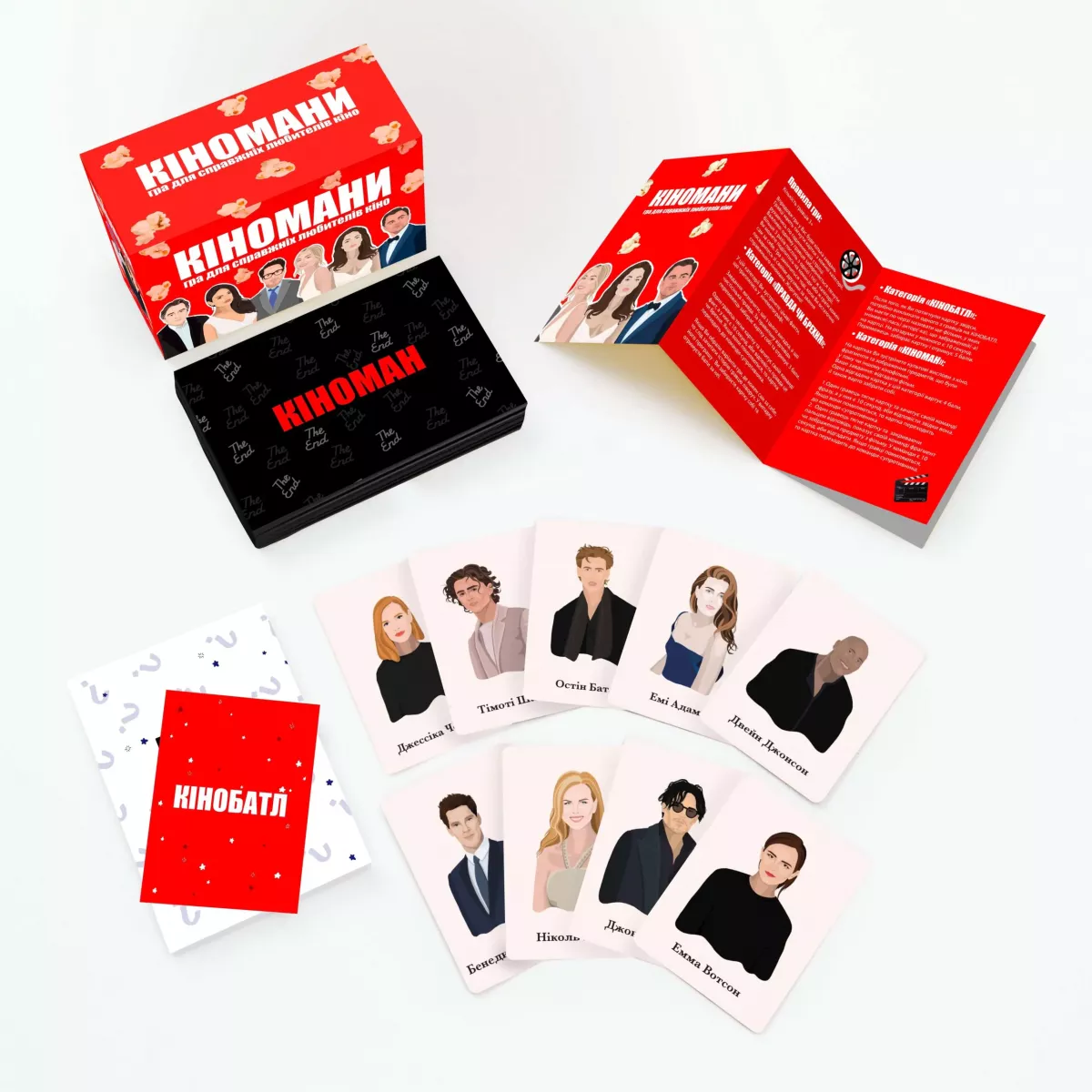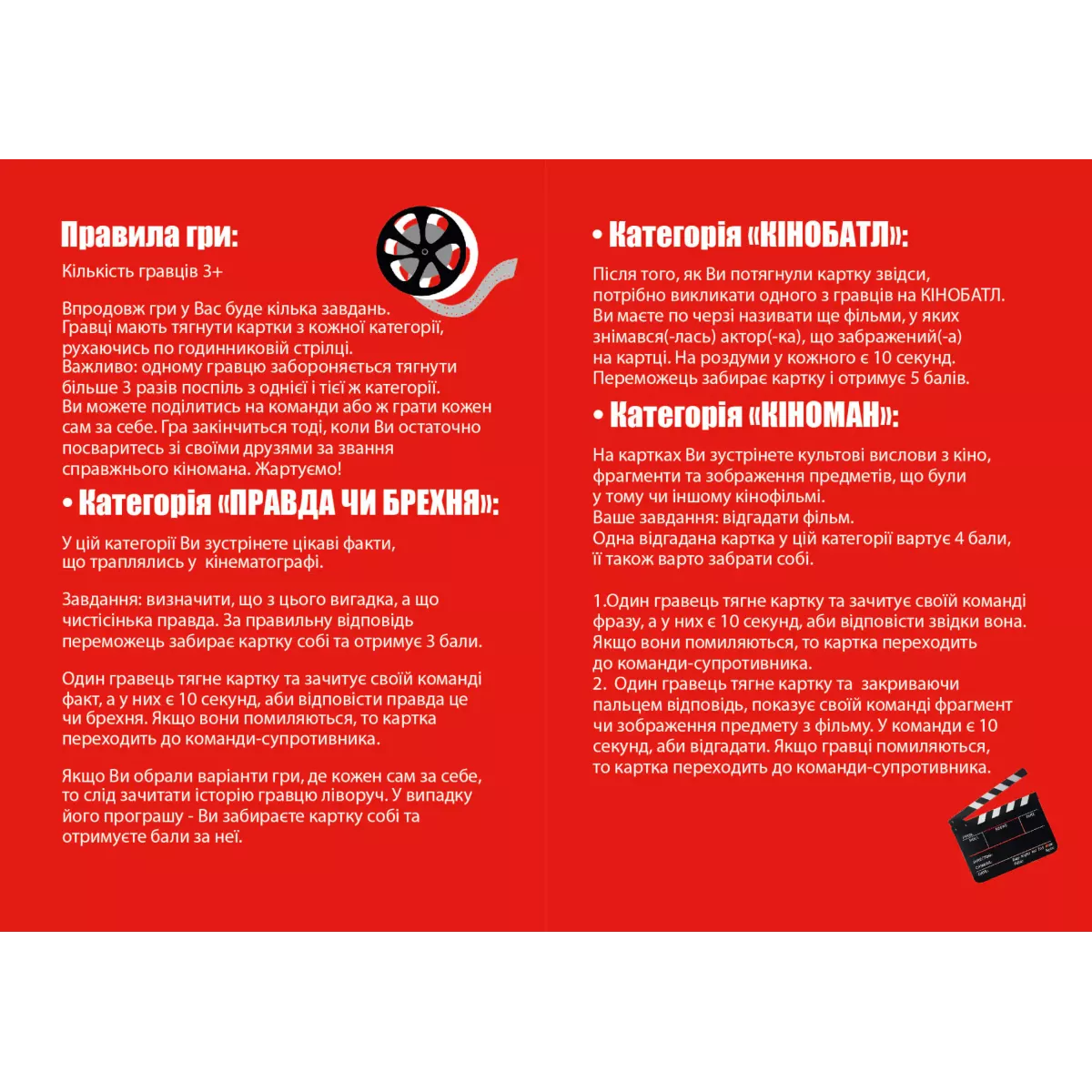 У вас часто-густо ставалися суперечки з друзями з приводу того, хто з вас найбільший кіноман, хто краще знає фільмографії акторів та великодки у культових кінокартинах? Завдяки настілці-вікторині Кіномани у вас нарешті є змога остаточно вирішити це питання! Ця гра спеціально для веселої компанії від 3 людей розроблена спільно із Загоном Кіноманів, тож питаннячка у грі будуть для справжніх поціновувачів кіномистецтва! Як грати? Це ж вікторина, грати можна так, як забажаєте! Один стос карт містить факти про кінофільми, а гравцям необхідно вгадати, правда це чи брехня. У іншій колоді знаходяться кадри з фільмів, цитати, або якісь культові елементи, тут переможний бал отримає той, хто перший вгадає кінострічку. Також можна влаштувати батл з актором! Гравці по черзі будуть називати фільми, у яких грав цей актор. Переможець забере собі картку, а якщо зібрати від трьох акторів, які знімалися в одній стрічці – можна отримати ще й додаткові бали! Тож гра Кіномани - це веселий початок вечірки, яку можна закінчити переглядом фільму, аби потім зіграти ще партійку! Навіть якщо ви програєте – не засмучуйтесь! Пару нічних марафонів фільмів Кубрика або Тарантіно і можна викликати друзів на реванш! Залишилось лише придбати коробочку з грою Кіномани, та, за бажання, величезний телевізор (не йде в комплекті до настілки). Якщо ж ви бажаєте перевірити свої знання не тільки у кінематографі, а й у історії, літературі чи географії України – зверніть увагу на гру Шевченко питає, у якій ви зможете дізнатися безліч цікавинок про рідну країну.