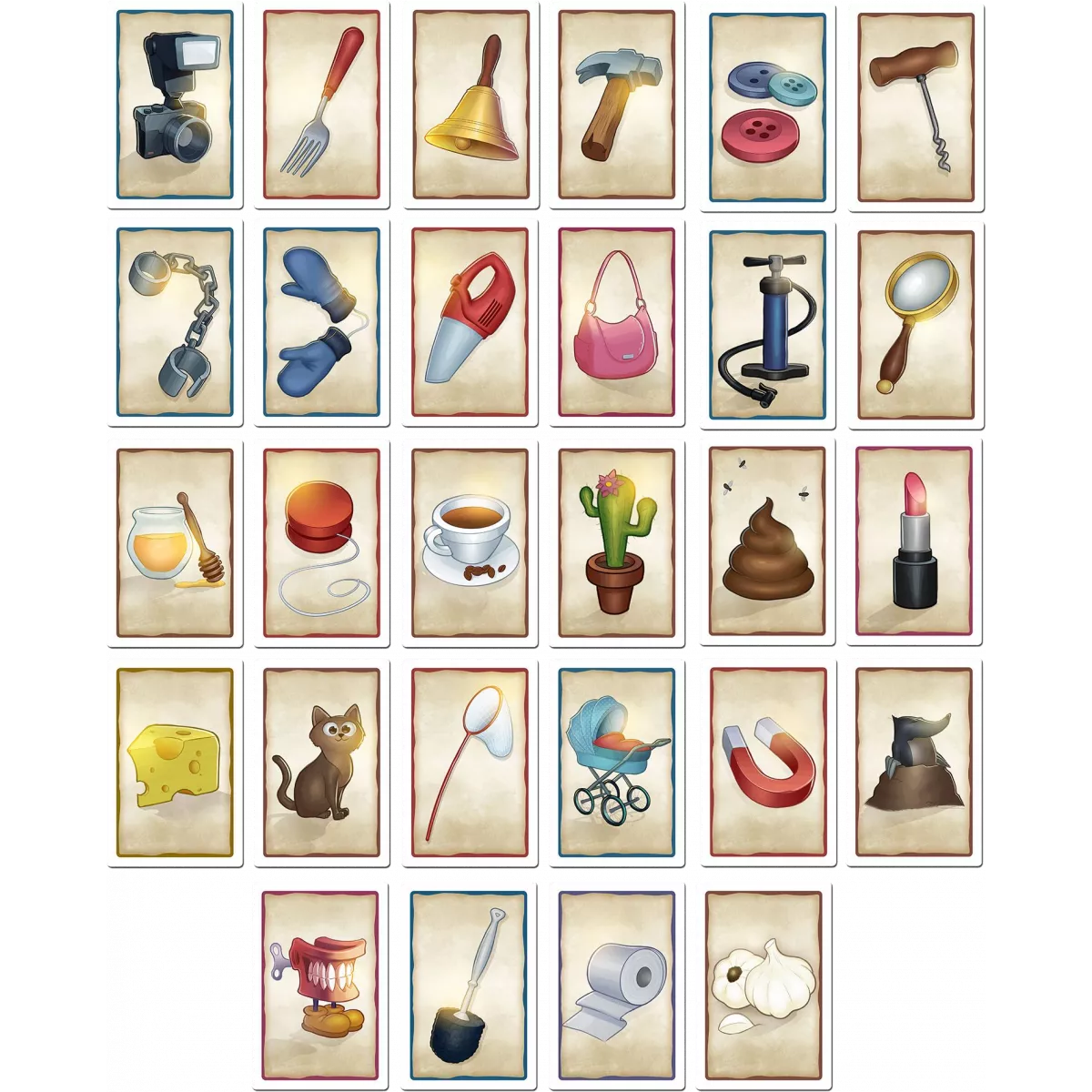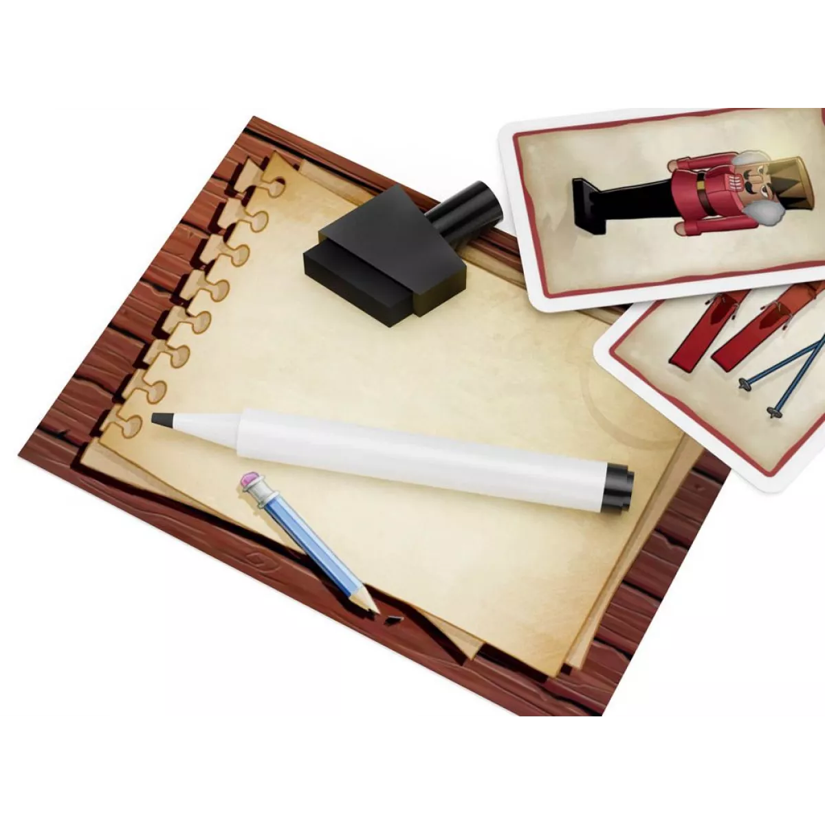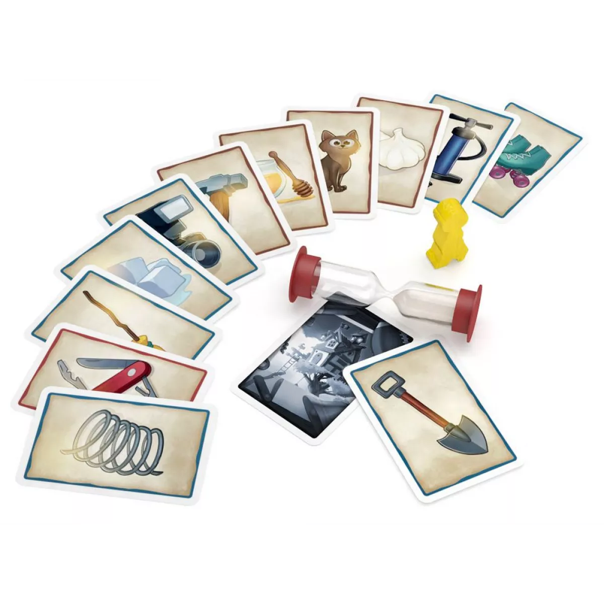 У коробці 110 карток предметів;, книга пригод;, ігрове поле;, 3 жетони відповідей;, планшет для записів та маркер;, фігурка шукача пригод;, пісковий годинник;, правила гри.