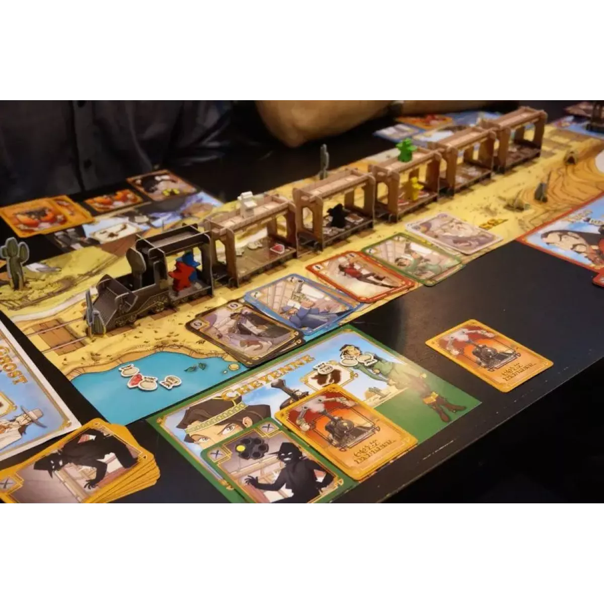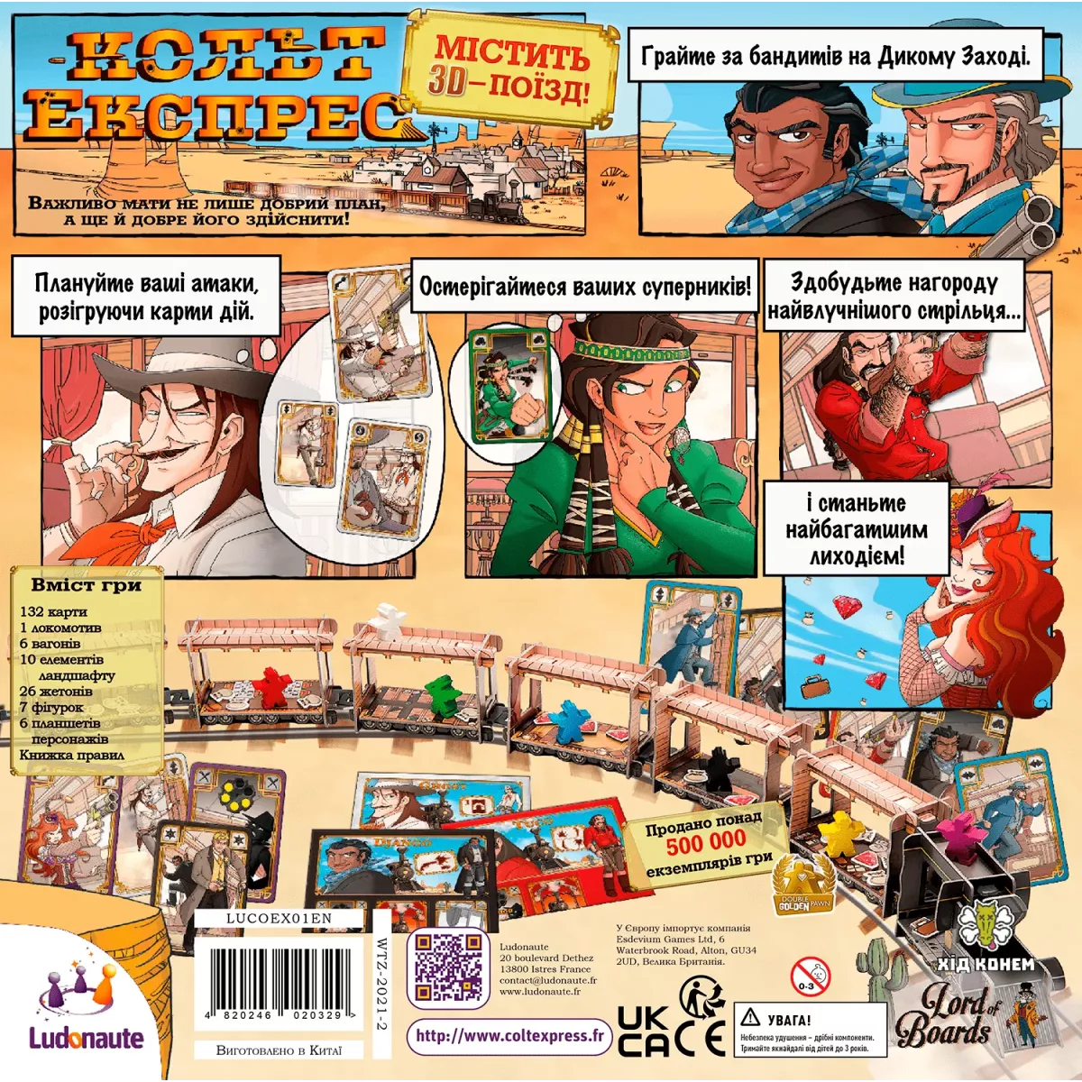 Кольт Експрес: пригода в стилі вестерн Лишень декілька століть тому проїхатися залізницею вже саме по собі було справжньою пригодою. Особливої пікантності такій прогулянці надавав проїзд Диким Заходом, де, напевно, тільки лише немовлята не вміли майстерно стріляти, й не виношували планів щодо чергового пограбування потяга, що проходить повз... В основі сюжету настільної гри Кольт Експрес (Colt Express) реальна історія про гучний розбійний напад на експрес-поїзд компанії Юніон Пасифік, який вирушив з Фолсома штату Нью-Мексико з 47-ма пасажирами і одним маршалом, супроводжуючим зарплату для працівників вугільної корпорації. Та за декілька хвилин всі почули звуки пострілів, адже виявилось, що не одному розбійнику впала в око така ласа можливість... Розпочата перестрілка трішечки зіпсувала плани бандитів, тепер не виключено, що багата здобич може дістатися лише одному - найкмітливішому та найшвидшому.   Настільна гра Кольт Експрес (Colt Express) популярна в усьому світі, і з моменту появи вже має декілька видань. Тільки 2015 року настілочка отримала 9 нагород, ставши лауреатом відомих конкурсів у сфері настільних ігор: Juego del año en España; Gouden Ludo; Les Trois Lys; Gioco dell'anno; Spiel des Jahres; As d'Or - Jeu de l'Année; зайняла призові місця в преміях Magyar Társasjátékdíjban (1 місце), Deutscher Spiele Preis (3 місце), Tric Trac D'or (3 місце); а у 2016 році номінувалася на премію Spel van het Jaar. Усім залишатися на місцях! Настільна гра Кольт Експрес пропонує компанії 2-6 гравців перетворитися на кровожерливих грабіжників і здійснити справжній розбійний напад на потяг. Мета гри: стати найбагатшим і цілим бандитом. Доречі за влучність передбачена окрема винагорода. Ігрове поле представлено у вигляді збірного локомотива і вагонів, кількість яких має дорівнювати кількості гравців. По всьому потягові розміщуються гаманці пасажирів з різним рівнем доходу за типом і кількістю жетонів, зазначених всередині вагонів. При цьому в самому локомотиві зручно розмістився маршал з набитим грошима кейсом. Роль маршала в ході партії - всіляко перешкоджати грабіжникам збагатитися за рахунок чесних людей, тож гравцям потрібно буде вдаватися до різноманітних хитрощів, щоб відвернути увагу маршала й заволодіти наміченою здобиччю. Перед початком партії гравці обирають собі фігурку бандита, отримують планшет персонажа зі своїми властивостями, набір карт дій і куль свого кольору. Всі колоди гравців абсолютно ідентичні і відрізняються лише кольором, тому в ході гри всім будуть доступні одні і ті ж дії. Ну й звісно ж, на початку партії всі барабани в револьверах заряджені повністю. За допомогою 5 випадкових карт раундів формується сценарій гри, де кожна окрема карта - це епізоди, що послідовно відкриваються. Визначивши першого гравця, учасники розміщують фігурки своїх персонажів наступним чином: непарні - в останньому вагоні, парні - в передостанньому. Партія триває 5 раундів, кожен з яких розділений на дві фази: Під час планування учасники розбійного нападу викладають з руки карти дій в загальний стос. Під час пограбування відбувається обов'язкова активація викладених в попередній фазі карт. Застосовуючи ефекти карт, гравцям доступні дії: переміщення між вагонами; підйом і спуск драбиною на дах вагона і назад; постріл або бійка з суперником; хитрі кривляння з обходу маршала з цькуванням на інших бандитів; і, власне, процед