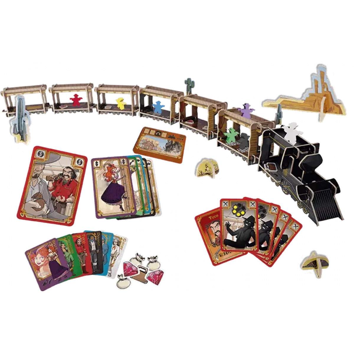 У коробці 6 вагонів, 1 локомотив, 10 елементів ландшафту, Жетони здобичі різної цінності, 17 карт раундів, 1 фігурка шерифа, 13 карт шалених куль, 6 карт персонажів, 60 карт дій, 36 карт куль, 6 фігурок бандитів