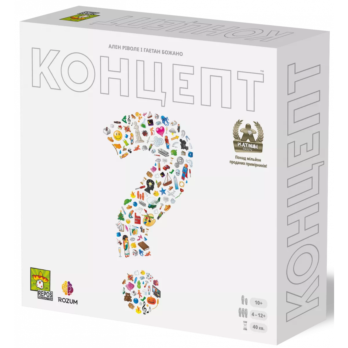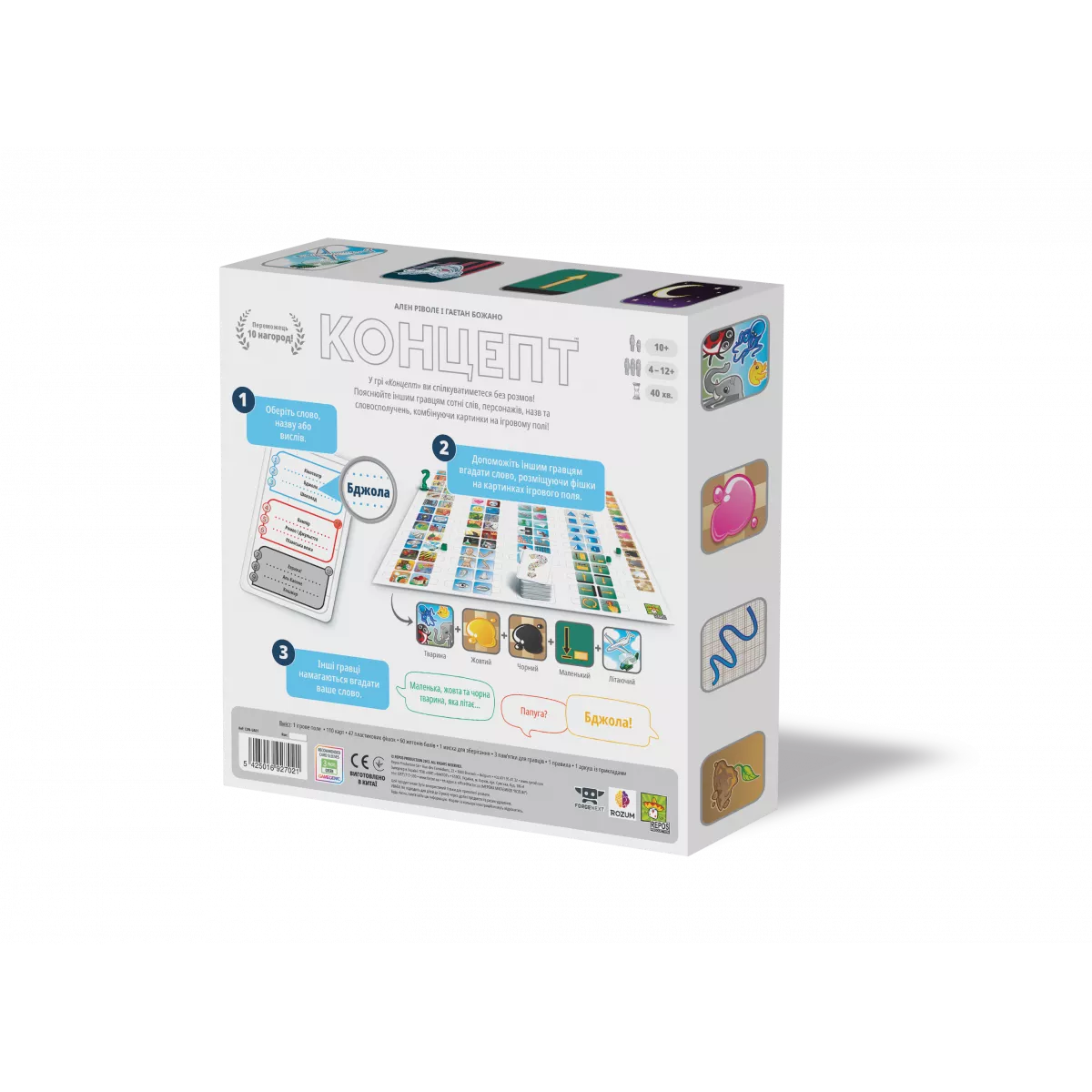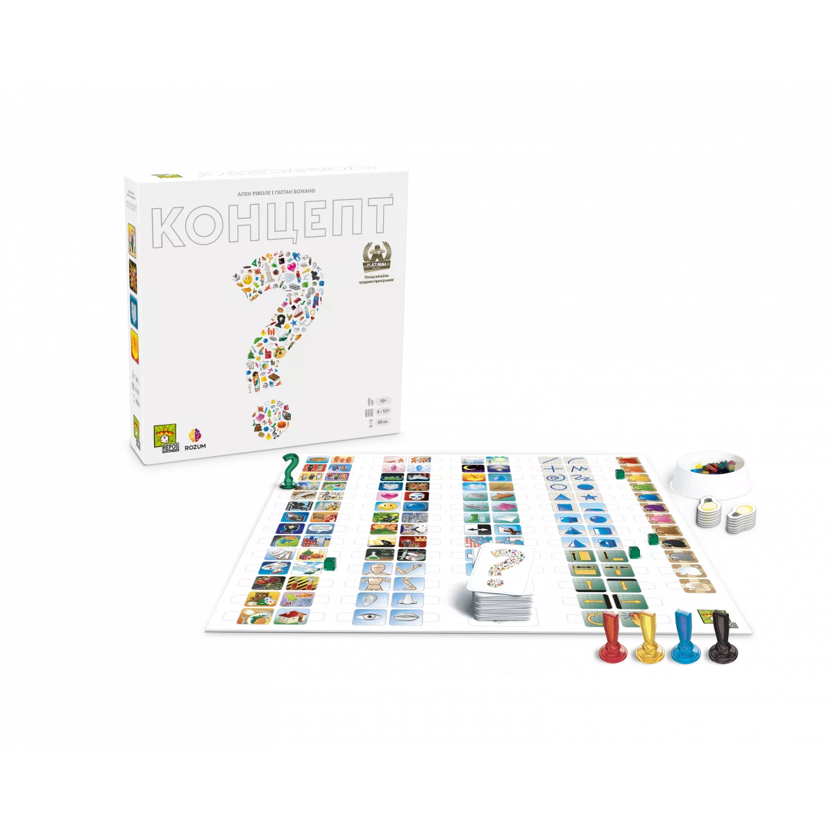 Як пояснити якесь поняття? Словами – зазвичай дуже просто, рухами - вже складніше, але всі ми знаємо ігри типу Крокодил, Актівіті чи Кескіфе, тому це - не неможливо. А якщо слово треба показати через малюнки властивостей і ознак, одна з яких – головна, а інші допоміжні? Звучить якось незрозуміло та майже неможливо? Але все не так! Адже у веселій розвиваючій сімейній грі Концепт вам не треба бути екстрасенсами, аби один одного зрозуміти! Ви просто будете давати влучні підказки іншим гравцям. Але те, як ці підказки виглядають – це основна цікавинка гри! Поясніть - як пояснювати?! Спершу, серед гравців обирають ведучих, на яких і буде покладено роль пояснити загадкове слово, вказане на картці. У грі присутні слова трьох рівнів складності, тож грати буде цікаво і дорослим, або профі у іграх на асоціації, і малечі, аби потренуватися в описі життєвих понять та явищ. Тож, повернімось до наших ведучих. Їм необхідно взяти знак питання та виставити його на поле на ту комірку, яка більш за все відповідає в загальному цьому поняттю. Маленькі кубики такого ж кольору треба поставити на менш важливі допоміжні характеристики-ознаки слова. До прикладу, вказуючи на полуницю знак питання доцільно поставити на рослину, а кубики - на червоний колір та круглу форму. Звичайно, є багато червоних круглих рослин, тому або варто дочекатися, поки інші гравці скумекають, що ви маєте на увазі, або використати знаки оклику - це допоміжні показчики, які працюють аналогічно до знаків питання. Основна проблема – це не перемудрити з підказками так сильно, щоб аж самому забути, що саме ви намагаєтесь показати… Адже переможні очки можна отримувати і за правильні відповіді, і за влучні пояснення! Тож якщо ви готові випробувати власні здібності у непрямому описі понять, або ж навпаки, постаратися вгадати щось за дууууже неочевидними натяками, вам варто звернути увагу на гру Концепт, яка повністю захопить увагу, думки та емоції кожного, від найменших до наймудріших! Та коли ви більше полюбляєте пояснювати поняття словами, а не малюнками, зверніть увагу на гру Довжина хвилі, у якій на величезному колесі ви будете намагатися пояснити поняття, яке знаходиться між двох протилежностей.