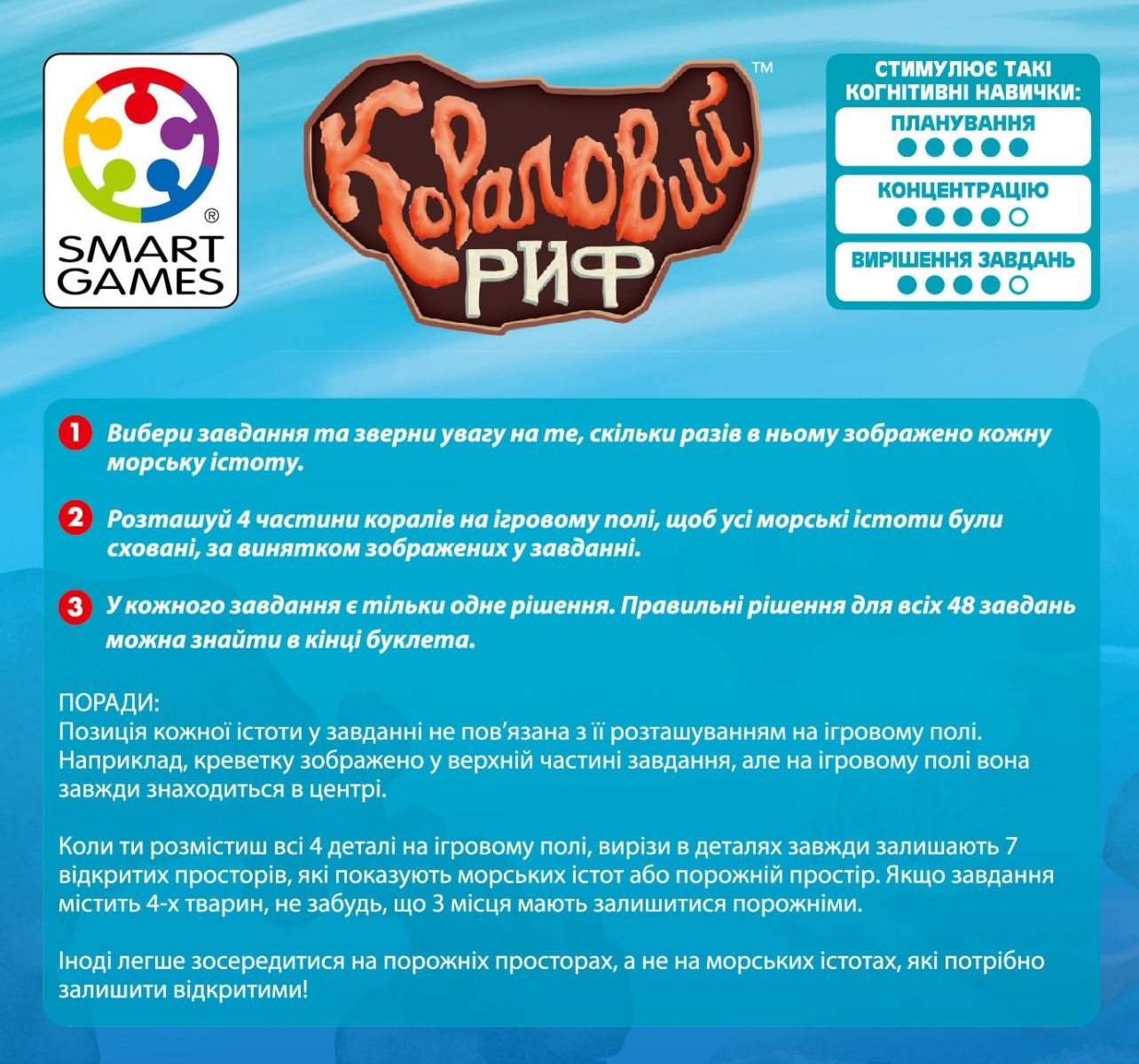 • Розвиток ключових навичок: «Кораловий риф» активно сприяє розвитку логічного мислення, концентрації уваги, дрібної моторики, просторової уяви та зорово-моторної координації. Дитина вчиться аналізувати ситуацію, планувати свої дії та виправляти помилки, що є надзвичайно важливим для її загального розвитку.