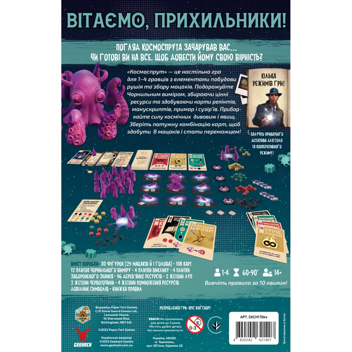 З небесних просторів на тебе дивиться Космоспрут! Використовуй силу чудернацьких артефактів, аби збагнути природу космічного головоногого. Доведи свою першість серед служителів Великого Чорнильника, здійснивши ритуал виклику Космоспрута! «Cosmoctopus» — це динамічна й різноманітна гра з механікою побудови карткового рушія, в якій учасники будуть мандрувати просторами космосу, аби по одному мацаку проводити позаземне божество до свого світу, використовуючи потужні ефекти реліквій, священних писань, сузір’їв та галюцинацій.