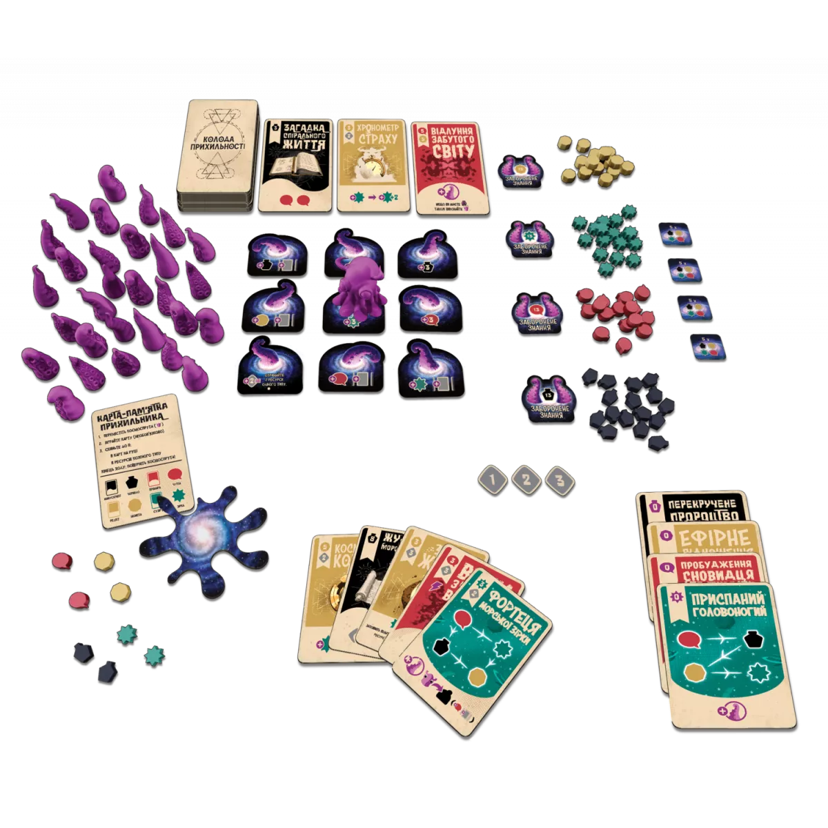 Побудова маршруту в Чорнильному вимірі. Поле для гри «Космоспрут» складається з плиток у формі різноманітних візерунків, що змінюють стратегію переміщення Чорнильного бога між локаціями. Локація, на якій Космоспрут зупиниться у ваш хід, принесе певні бонуси згідно із зображеними на плитці символами, тож вміло мандруйте космосом, щоб зібрати якомога більше необхідних вам карт і ресурсів.