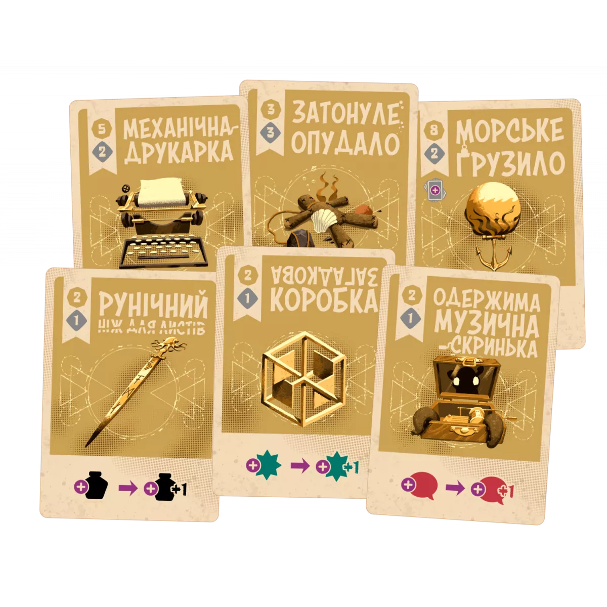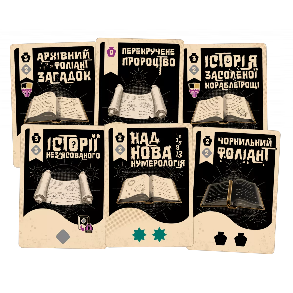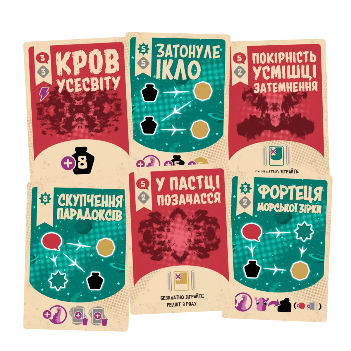 Мансукрипти (чорні, потребують чорнил). Мають постійні ефекти після розіграшу - надають знижку на відповідну кількість ресурсів. Деякі карти манускриптів також мають ефект «Поглинання», що є одноразовим й діє відразу після розігрування карти: скиньте з ряду усі карти манускриптів та реліктів та перемістіть Космоспрута на відповідну кількість кроків, отримуючи винагороду кожної плитки.