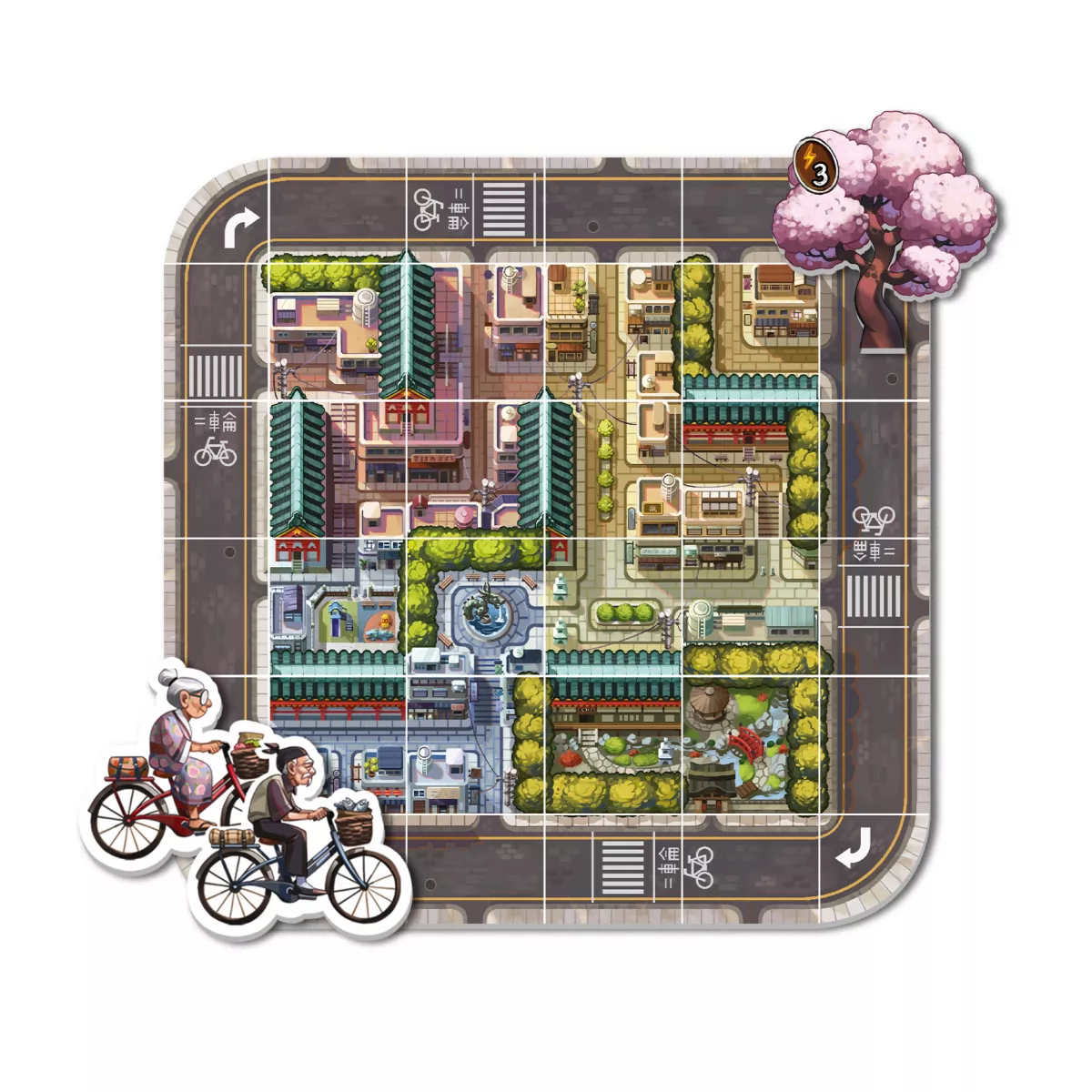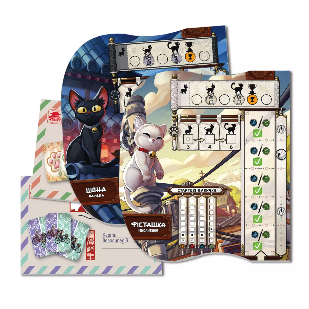 У коробці 1 двостороннє поле центру міста, 2 фігурки велосипедів, 6 фігурок сакур, 5 базових карт завдань, 16 карт велосипедів, 40 базових жетонів лапок зі скринькою для зберігання, 1 планшет сценарію, 1 кобан (маркер першого гравця), 2 кубики навичок, 10 жетонів переможеного ворога, буклет сценаріїв, правила гри, компоненти 4 кольорів кожного гравця -, 1 кошеня, 1 поле мікрорайону (стартова зона), 1 двосторонній планшет кошеняти, 1 планшет навичок, 4 маркери навичок (кубики), 1 маркер витривалості (кубик), 7 бубонців (2 запасні), 1 скринька для зберігання