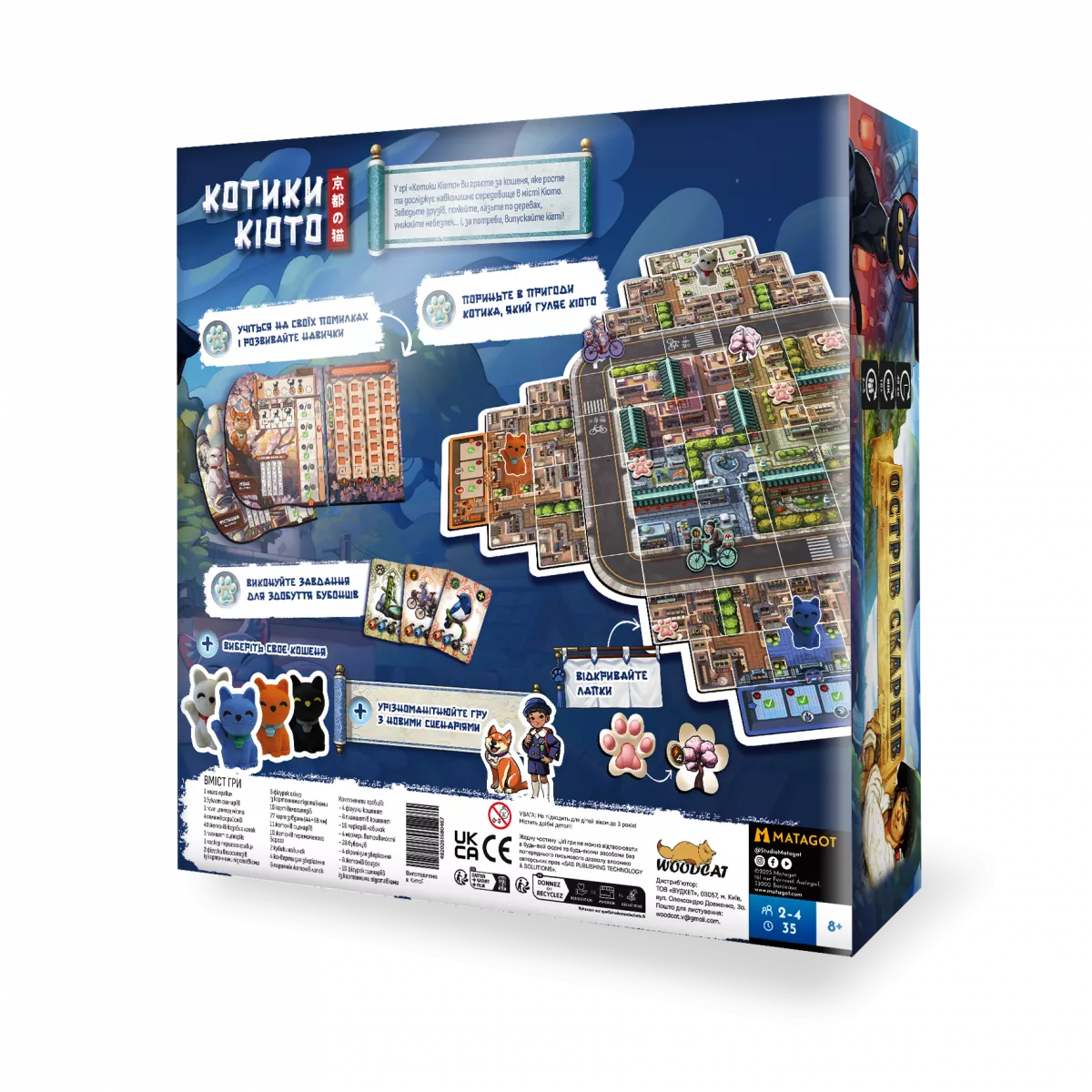 «Котики Кіото» — сімейна гра-перегони, у якій гравці стануть маленькими, але відважними кошенятами, що подорожують метушливими вуличками Кіото. Ви досліджуватимете території, змагатиметеся за звання найспритнішого та збиратимете бубонці. Яскрава стратегія з чарівною атмосферою перенесе вас у справжній симулятор котячого життя!