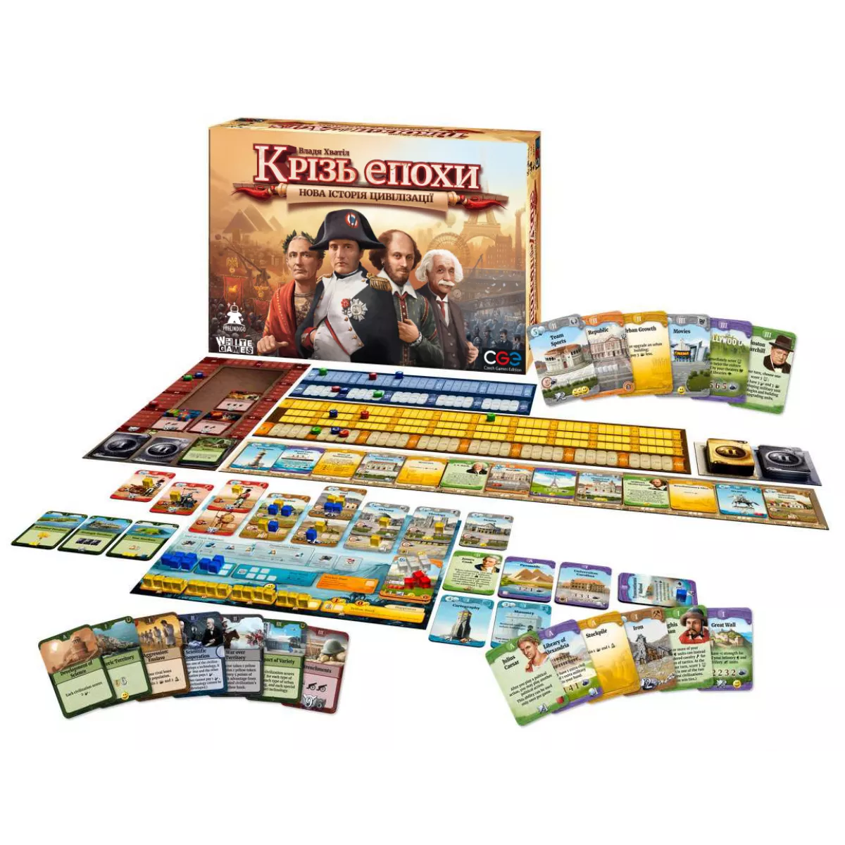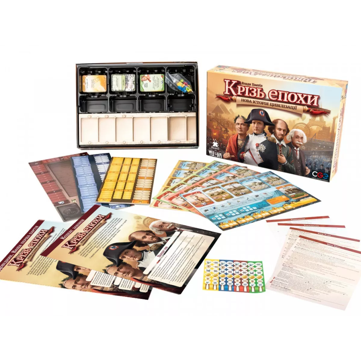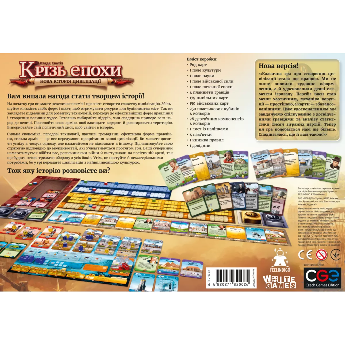 "Крізь епохи: Нова історія цивілізації" вирізняється не лише глибоким геймплеєм, а й якісним виконанням компонентів. У великій коробці ви знайдете: