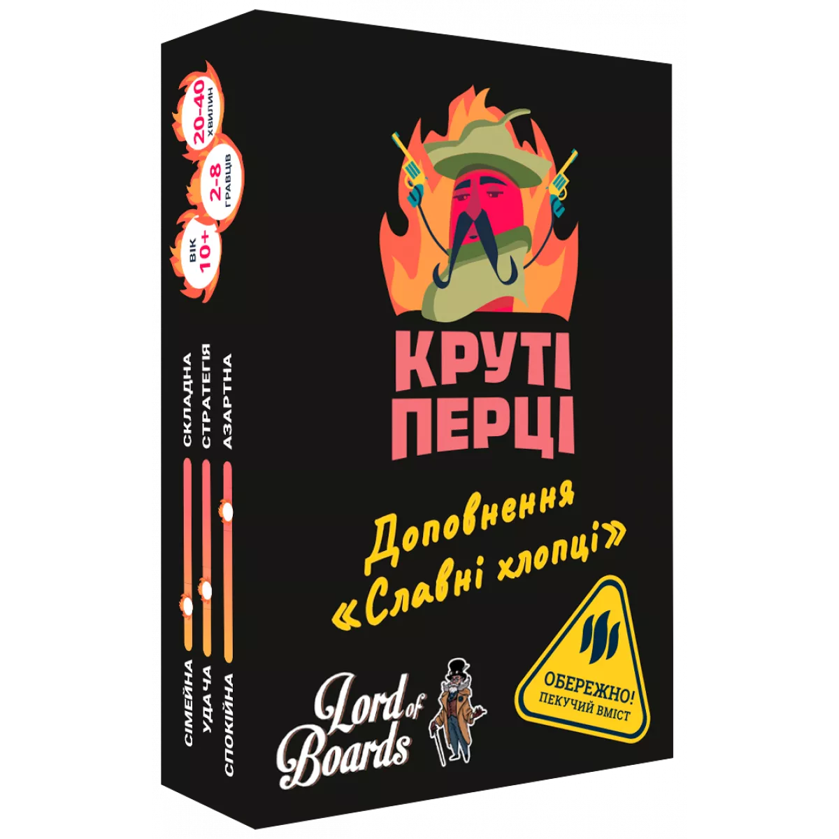 Увага! Це доповнення. Для гри потрібна базова гра Круті Перці.   Кажуть, що у місті з’явилися нові авторитети, а характер їх такий пекельний, що аж нема куди сховатися! Схоже, старі банди трохи потісняться, коли на сцену вийдуть нові розбишаки. Доповнення Круті Перці. Славні Хлопці додає свіжу гостринку у гру Круті Перці у кількості майже чотирьох десятків карток із мафіозі 5 різних банд. Кожна з банд має свої особливості, але ці розбишаки не уживаються з деякими конкурентами. Тому карти перців базової версії із таким самим номіналом, як банди доповнення, доведеться вилучити з гри. Але тільки нових перчиків для цілого доповнення було б замало, чи не так? Тому коробочка Славних Хлопців пропонує вам ще й колоду карток хитрощів! Кожен раз, коли ви збираєте нову банду, ви можете взяти собі на руку одну карту хитрощів. Це буде суттєва, проте єдиноразова перевага, яка може врятувати ваших членів банд у найскрутніший момент! До прикладу, ви можете врятувати перця собі на руку, якщо його кинули за грати, або відмінити свою атаку, якщо суперник її нейтралізував! Масштаби тактичних дій із цим доповненням збільшуються в рази, і якщо вам припала до душі базова гра Круті Перці, то вам точно сподобається оновлений та урізноманітнений ігровий процес з доповненням Круті Перці. Славні Хлопці. Про те, як грати з використанням доповнення Круті Перці. Славні Хлопці, дивіться у правилах до гри Круті Перці  на сторінці 22.