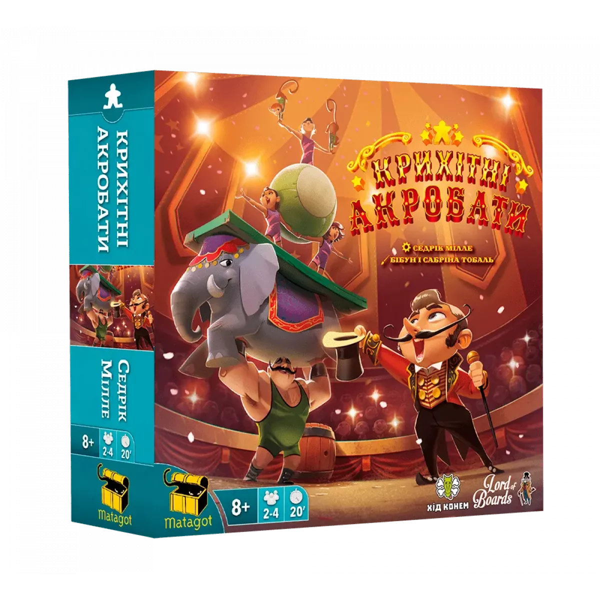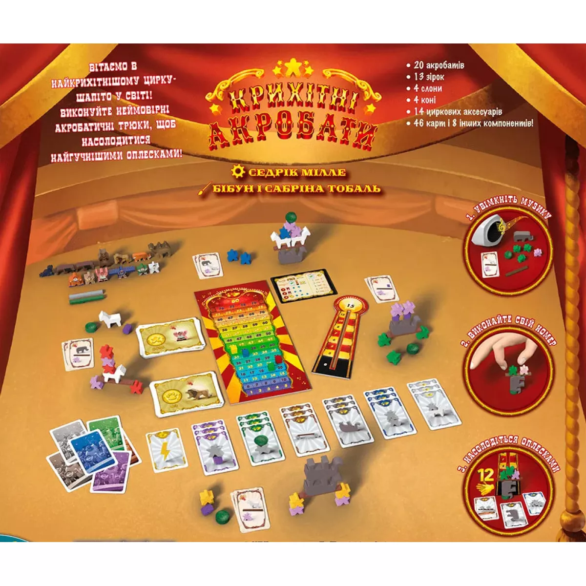 Пані та панове, ви потрапили на виступ легендарного цирку крихітних акробатів! Тільки сьогодні у вас є можливість побачити 3 наші виступи, які задовольнять усі ваші побажання. Займайте свої місця та очікуйте на шоу, яке запам’ятається вам на все життя! Чи можливий цирк взагалі без тварин? ТАК! Тільки якщо це настільна гра Крихітні акробати (Tiny Acrobats) від видавництва Lord of Boards. Ласкаво просимо до унікального цирку! Настільна гра Крихітні акробати – це неймовірно яскравий балансир, такий собі новий рівень усім відомої гри Дженга, у якій кожен максимально відтренує свою мілку моторику, швидкість реакції, терпіння та концентрацію уваги. Партія триває 3 раунди, протягом яких учасники поступово будуть отримувати все більше й більше компонентів для своїх вистав, намагаючись виконати найвигадливіші трюки та заробити якомога більше оплесків глядачів (тут вони називаються очками оплесків). Набирати очки оплесків можна двома способами: 1). кількість вподобань публіки, виконаних у номері (у цьому допомагатиме пам’ятка),  2). висота номера: аби виміряти висоту найвищого акробата й дізнатися, скільки очок оплесків отримає гравець, в грі використовуватиметься спеціальна лінійка - оплескомір. Додаткові очки оплесків можна заробити, якщо ви першим завершуєте свій номер. То ж уважно дослідіть і запам'ятайте, що саме зараз хоче бачити публіка, і намагайтеся вибудувати максимальну висоту вашого номеру. Людей завжди вражали акробати під самим куполом цирку! Кожна партія, як вже було сказано, складається з трьох окремих номерів, кожен з яких проходить наступним чином: Все розпочинається із приготування, коли учасники отримують компоненти для своїх вистав. Слідом можна переходити й до самого виступу. У додатку засікається час, а гравці мають 2 хвилини, аби максимально задовольнити публіку. Не забудьте крикнути щось магічно-переможне, щоби всі інші точно розуміли, що ви вже закінчили. Підрахуйте оплески (вони ж - переможні очки).  Не переживайте, якщо ви матимете менше 10 балів після всіх цих підрахунків, - публіка все одно радітиме, що ви хоча би стараєтесь! Другий раунд відрізняється від першого кількістю компонентів, а також - побажаннями публіки. А от на третій раунд ви вже не берете звичні компоненти: натомість до ваших акробатів доєднаються спеціально запрошені зірки, які зможуть допомогти отримати додаткові очки за виконані особливі умови. Партія триває до завершення третього номера. У кого буде найбільше оплесків, той і вважатиметься найкращим директором цирку! Саме про його чи її виставу ходитимуть легенди, а охочих потрапити на наступне шоу - будуть сотні, навіть тисячі! Крихітні, але такі веселі акробати! Створити власний цирк без жодних зусиль, з любов'ю і турботою про усе живе – виявляється доволі просто, якщо використовувати для цього всього декілька міплів та інші дерев’яні компоненти гри Крихітні акробати. І так, це дуже захоплююче і весело, адже доводиться постійно придумувати, як швидко розташувати всі доступні компоненти в максимально високу фігуру, щоб вийшов красивий номер і отримати якомога більше оплесків. Отож, потрібно ще враховувати побажання публіки, які змінюються ледь не кожної хвилини! Гра відмінно підійде як для затишних сімейних посиденьок, так і для веселої гучної вечірки - повірте, гарний настрій, море позит