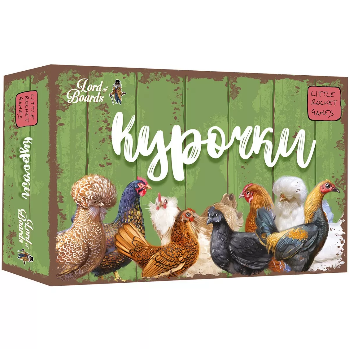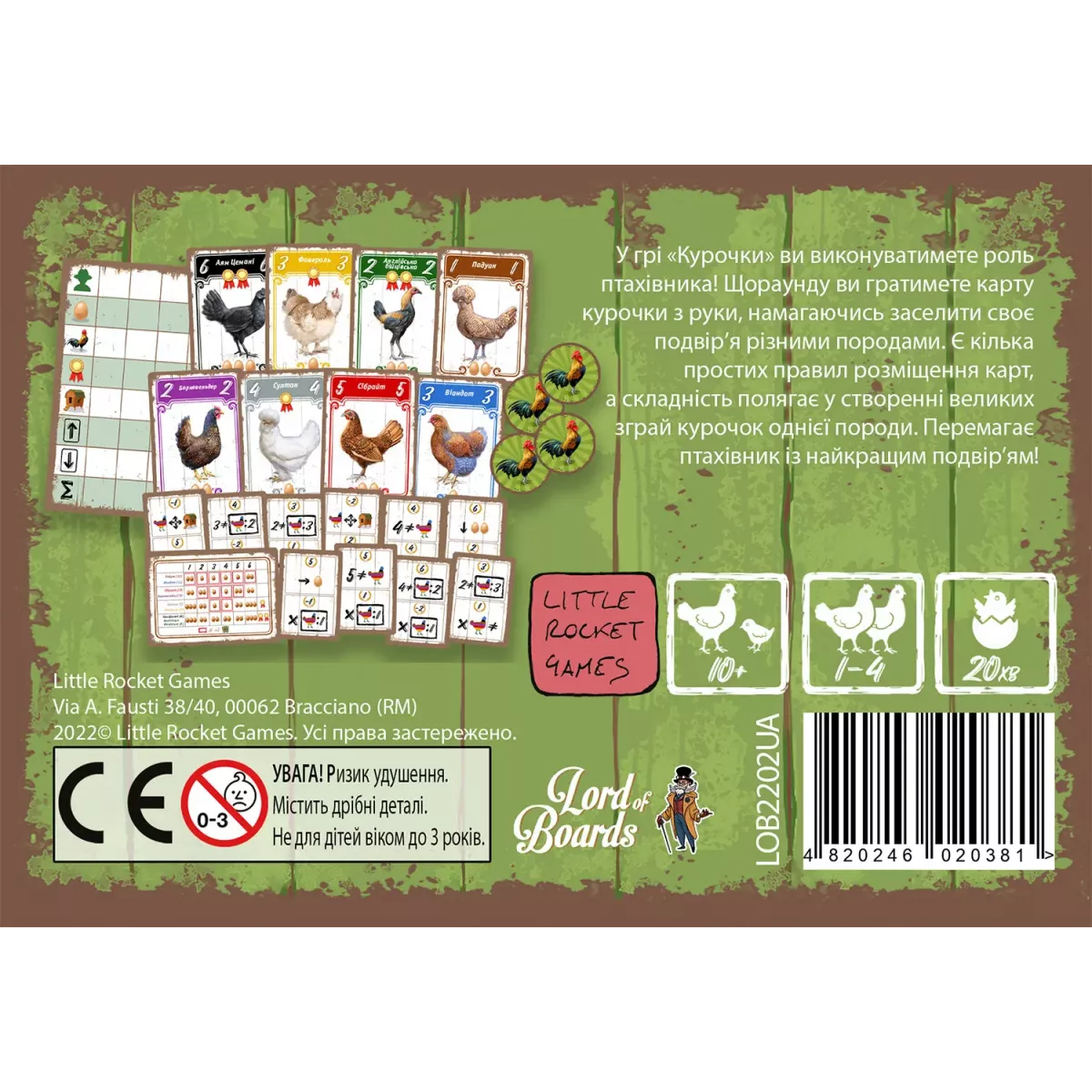 Наші бабусі та дідусі вже давним-давно займаються фермерством, хоча, можливо, тоді такого слова не знали. Розведення тварин і сільське господарство – це якраз те, за що їх і можна назвати фермерами. А чи хотіли би ви зайнятися чимось подібним? Наприклад, мати декілька своїх власних курочок? До чого це ми? У вас буде можливість зайнятися розведенням птиці в картковій настільній грі, що так і називається – Курочки (Hens). Це нова локалізація від компанії Lord of Boards, яка подарує вам разом із доволі простими правилами захоплюючий ігровий процес. Відкривайте своє фермерське господарство та готуйтеся до появи все більшої кількості курочок в ньому! Розводити птицю доволі просто! Чи не дуже? Курочки – це карткова настільна гра для всієї сім’ї, у якій гравці протягом партії намагаються заробити якомога більше переможних очок шляхом викладання карт курочок з руки на своє подвір'я за певними правилами розміщення карт. Складність полягатиме у створенні великих зграй курочок однієї породи. Адже наприкінці гри ви набираєте переможні очки саме за найбільшу зграю курочок однієї породи на своєму подвір’ї, за жетон півника, а також за виконання умови карти цілі. Не забувайте, що деякі рідкісні курочки з зображеними на картах медалями також дають переможні очки наприкінці гри. Перемагає птахівник із найкращим подвір’ям! Хто ж нам курочок подарував? Кожного разу опис нашої локалізації не обходиться без невеличкої біографії автора. Цього разу багато ми вам не розповімо, адже італієць Джампаоло Раццино лише починає свій шлях у світі настільних ігор. Розпочав він свою діяльність у 2018 році, створивши проєкти «Квіти» та «Dream: Сни та Кошмари». Вони не отримали шаленої популярності та не розлетілися. Чого не скажеш про нескладний абстракт Курочки. Просто впевнені, що ця гра точно заслуговує на вашу увагу! До речі, це чи не перша гра за всю історію українських локалізацій, самий перший наклад якої в світі вийшов спочатку українською, в Україні, і лише згодом - англійською, німецькою... Також відмітимо художника, що створив ілюстрації до цієї настілки - італійця Марко Салоньї. Він більше відомий своїми роботами з рекламою та зображеннями до дитячих книг, та й різноманітних нагород чоловік за свою діяльність отримав немало. А от в ігровій індустрії він теж поки лише починає робити перші відчутні кроки. Ми починаємо, вже чути кудахкання... Напевне, немає сил терпіти, - так хочеться дізнатися, як же грати? Розпочнімо, як завжди, з підготовки. Грати може від 2 до 4 гравців і для різної кількості гравців будуть свої невеликі зміни: десь буде використовуватись уся колода, а десь - доведеться позбутися якоїсь породи чи декількох для балансу. Усі картки, що лишилися, необхідно зашафлити (перемішати) і роздати гравцям по 4 картки. Окрім того, усі отримують по одному жетону півня. Насамкінець потрібно дістати з карт цілей одну та розмістити у центрі столу так, щоб усі гравці могли зручно роздивитися. Гравці виконуватимуть дії по черзі за годинниковою стрілкою. У свій хід ви маєте три опції, які потрібно виконати саме в такому порядку: - Узяти дві нові картки: можна брати як із загальної колоди, так і верхню зі скиду будь-якого гравця, окрім себе. Другий варіант заборонений протягом першого раунду. - Розмістити курку на своєму подвір’ї, щоби вона була прилеглою до якоїсь 
