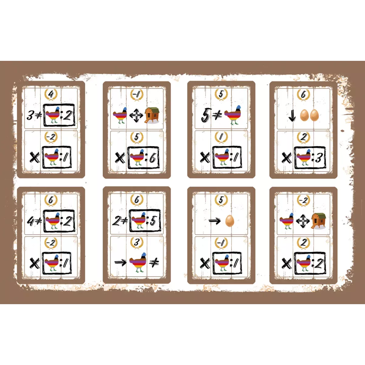 У коробці 72 картки курочок, 4 жетони півників, 10 карток цілей, 4 картки-пам'ятки, 1 блокнот для підрахунку ПО, Правила гри