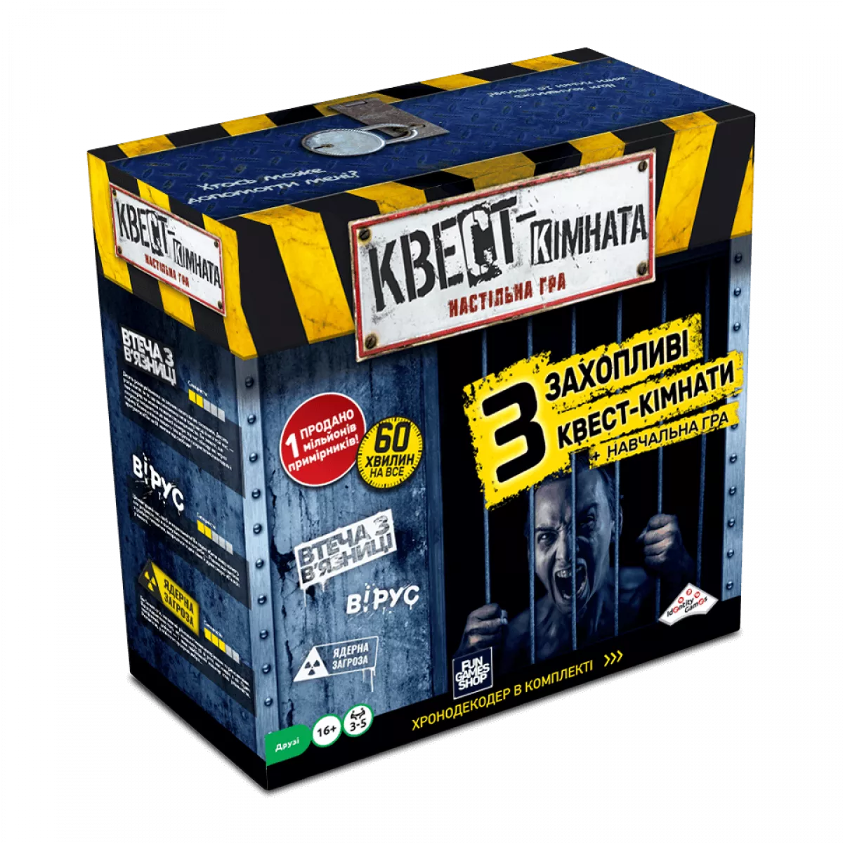 У коробці • 4 різні квести - Навчальна гра «Підвал», «Втеча з в'язниці», «Вірус», Ядерна загроза» (у порядку зростання складності), • Хронодекодер, • 16 ключів, • Підказки (4×8), • Дешифратор підказок, • 3 батарейки 1.5В типу AA не входять у комплект