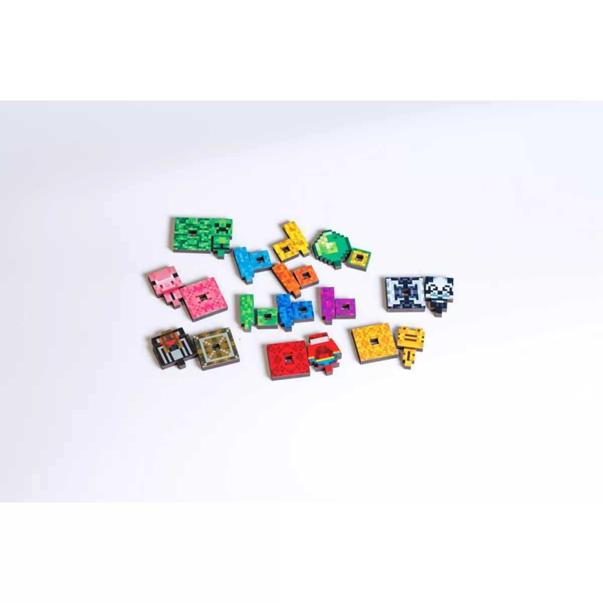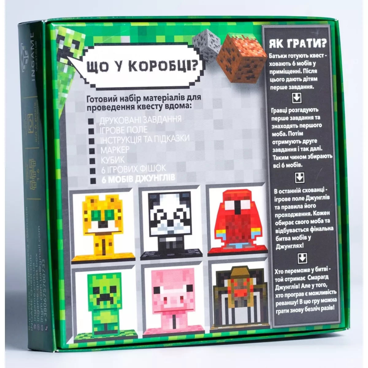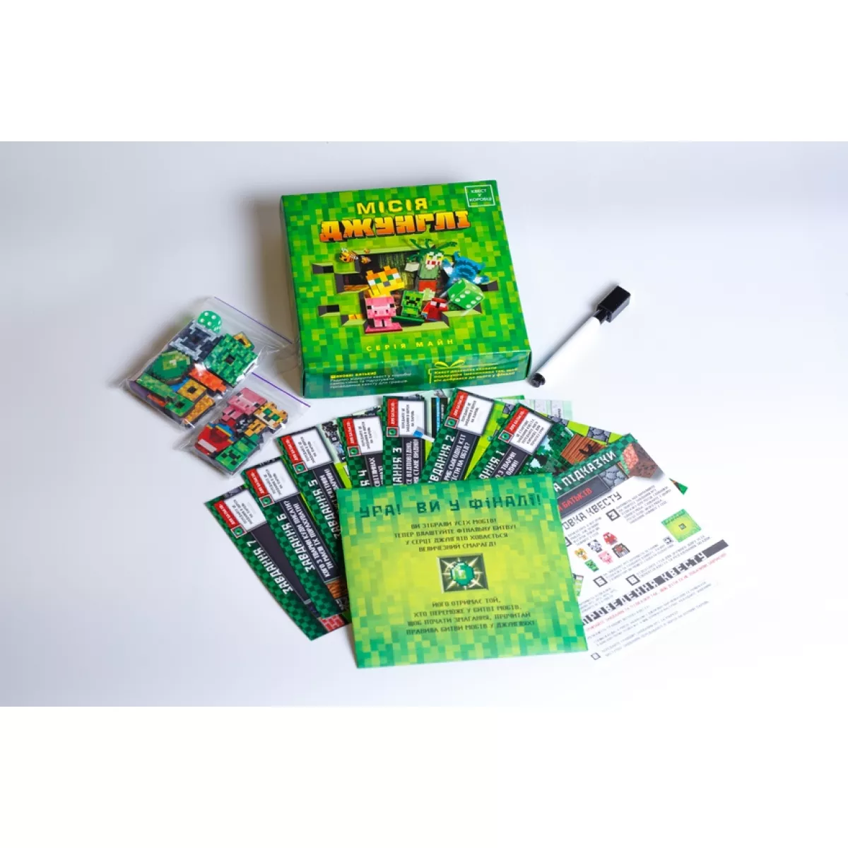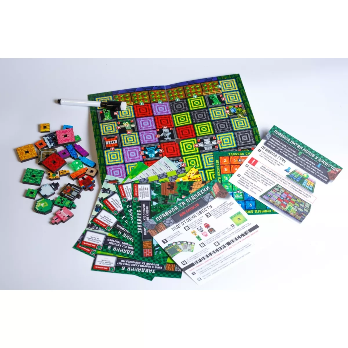 В комплекті маркери та глянцеві листи з завданнями, написи на яких легко стираються. А також об'ємні фігурки героїв Майн Крафту, які і будуть шукати гравці, виконуючи завдання на логіку.
