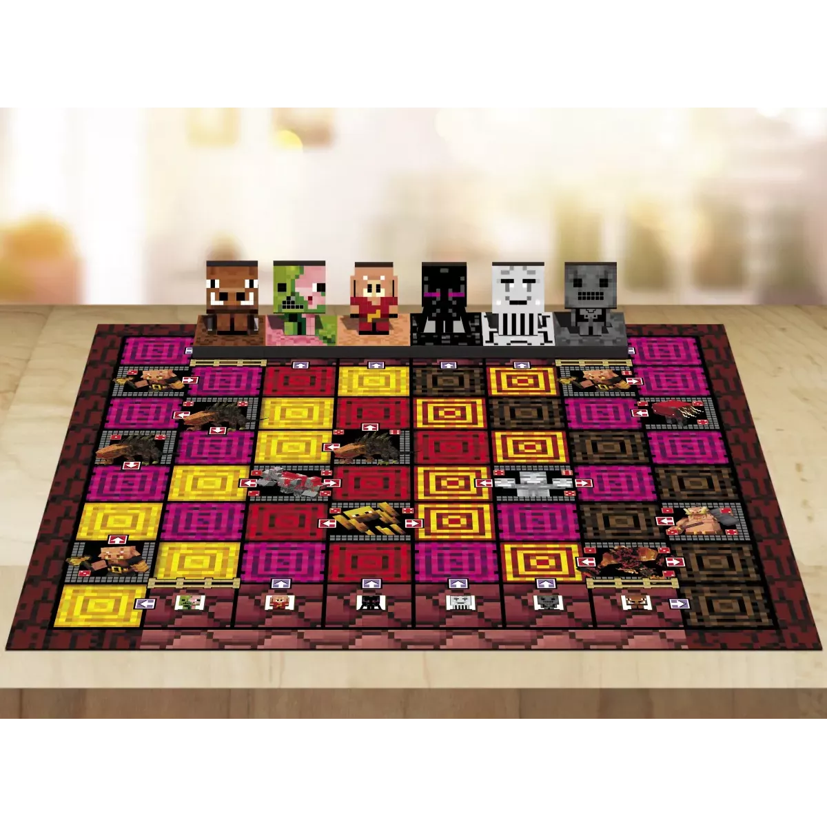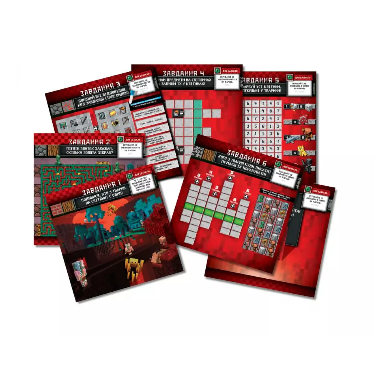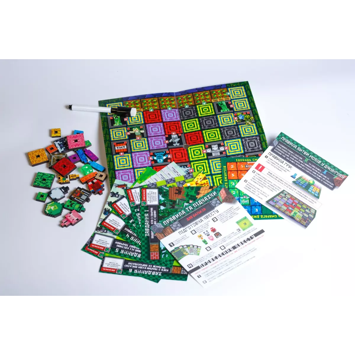 В комплекті маркери та глянцеві листи з завданнями, написи на яких легко стираються. А також об'ємні фігурки героїв Майн Крафту, які і будуть шукати гравці, виконуючи завдання на логіку.